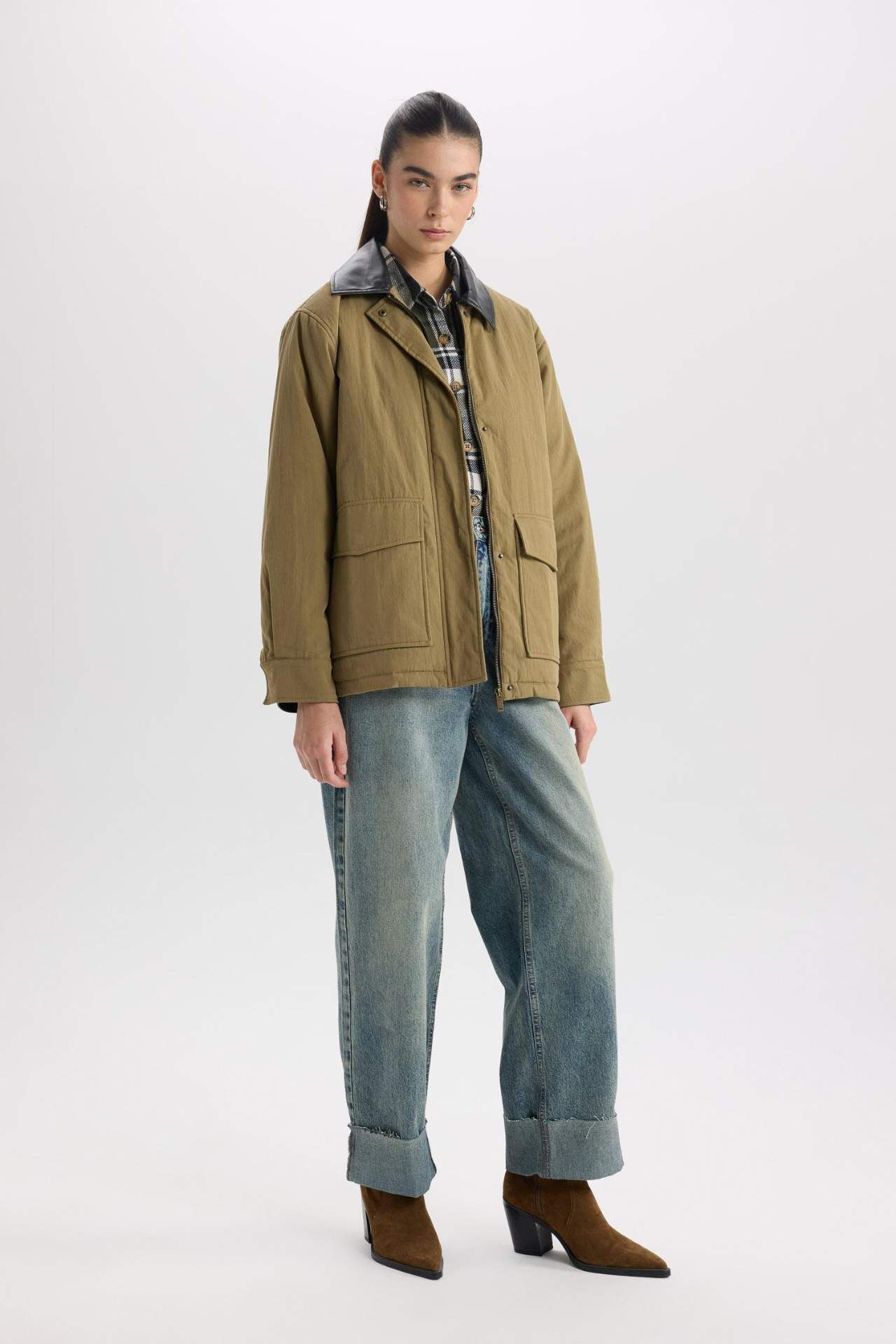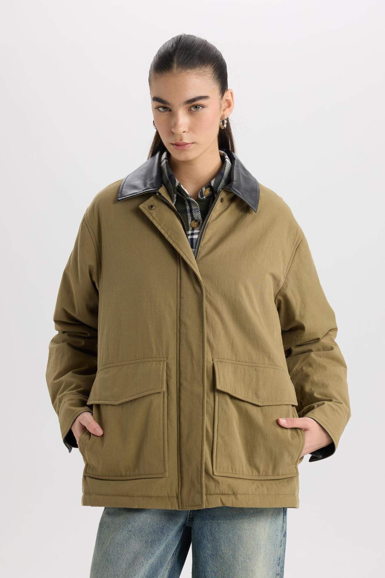 DeFacto Polo Yaka Fermuar Çıtçıt Kapamalı Cepli Mevsimlik Pamuklu Mont