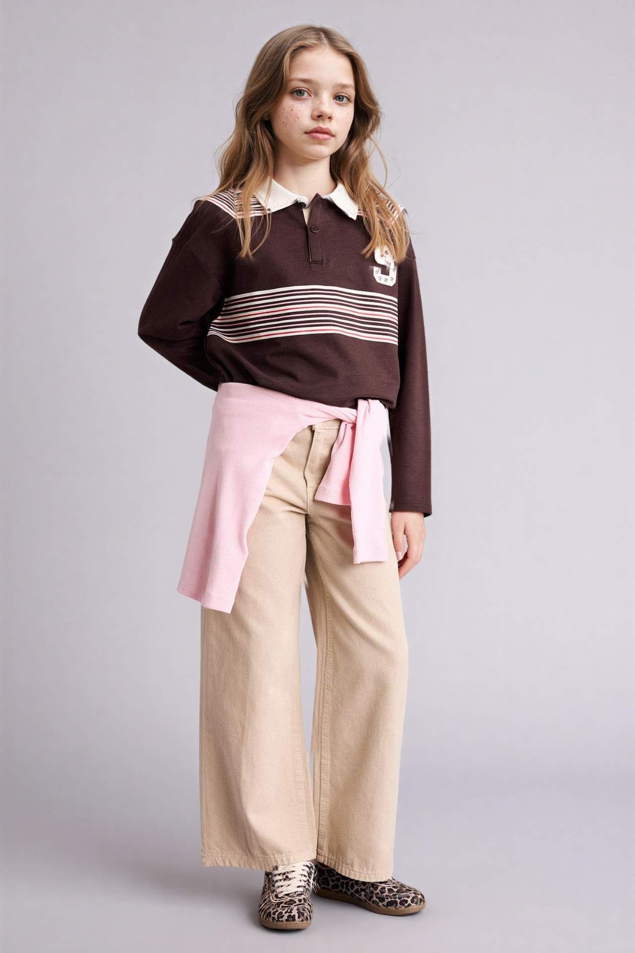 Polo Yaka Slogan Baskılı Sweatshirt Kumaşı Uzun Kollu Polo Tişört Kız Çocuk