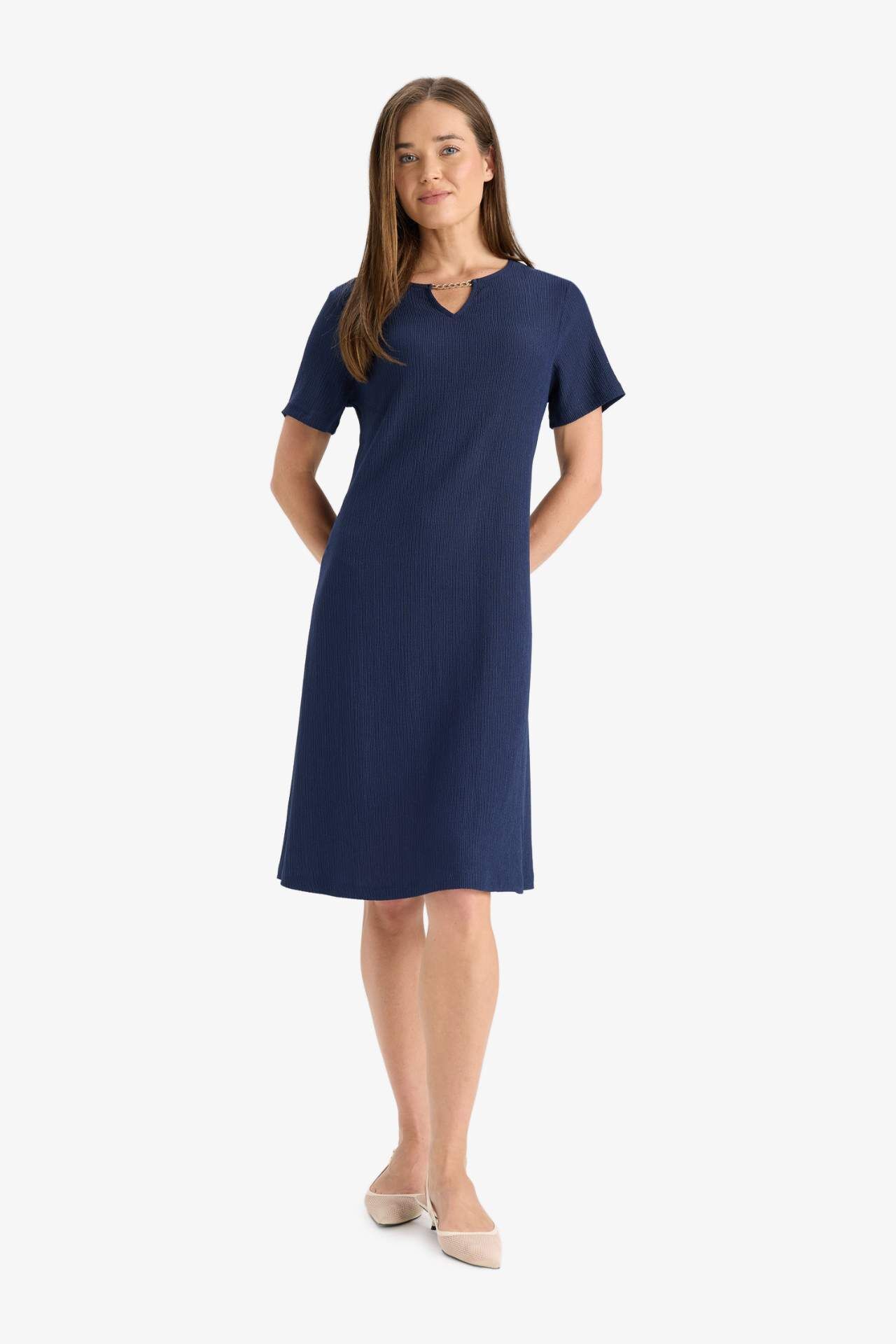 Regular Fit Apaş Yaka Basic Düz Bürümcük Kısa Kollu Midi Elbise