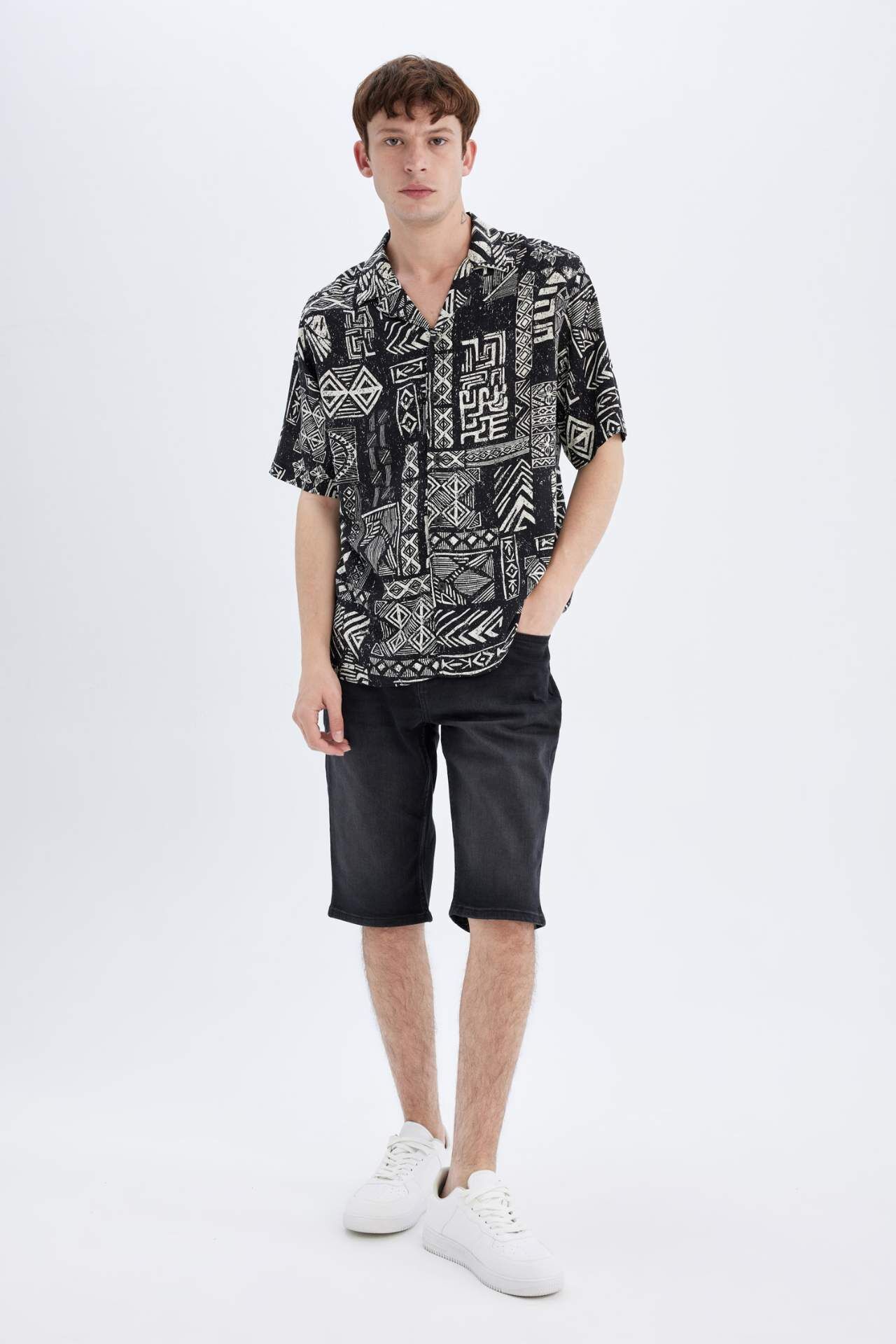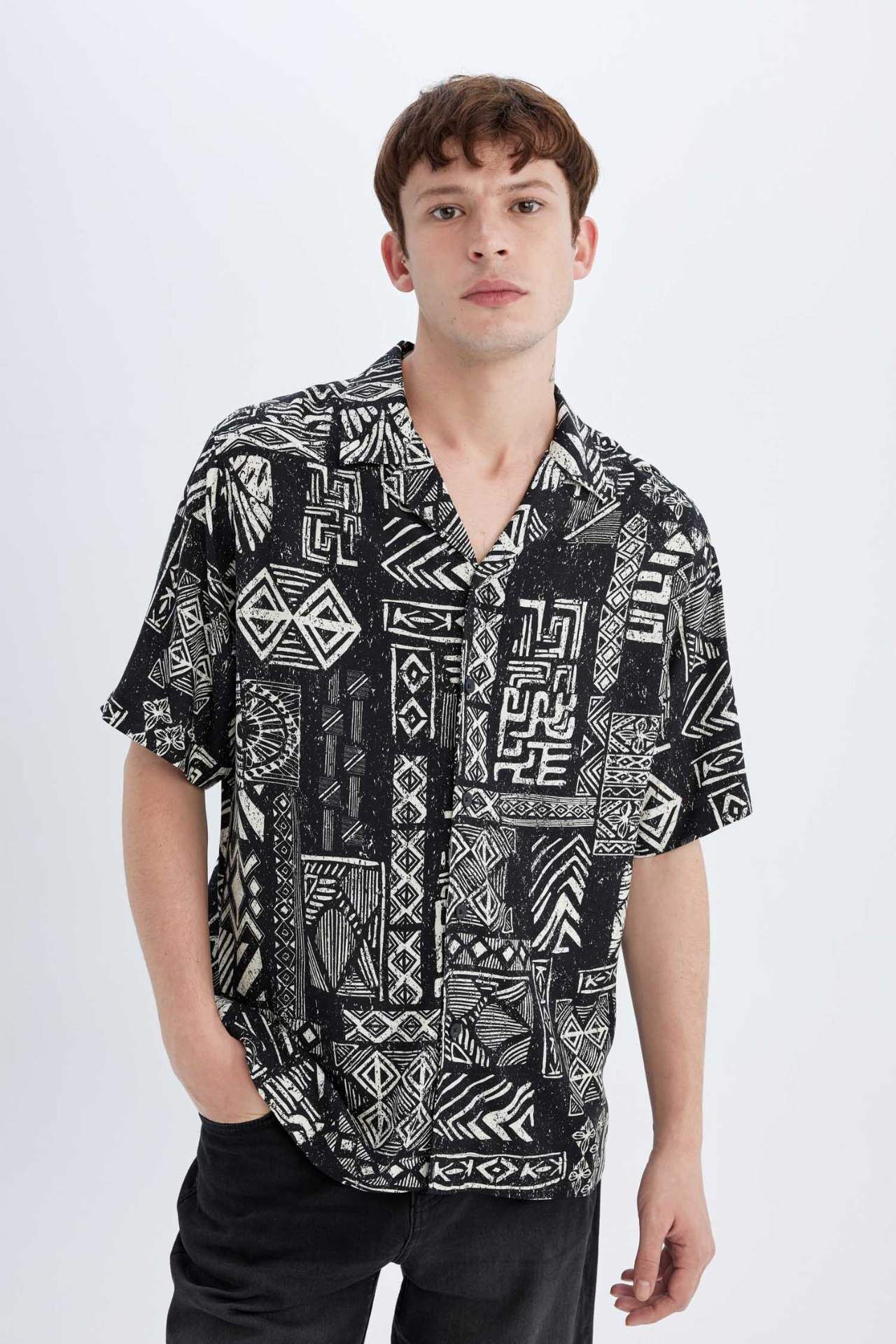 DeFactoFit Regular Fit Apaş Yaka Baskılı Viskon Kısa Kollu Gömlek C7686AX24SMBK81