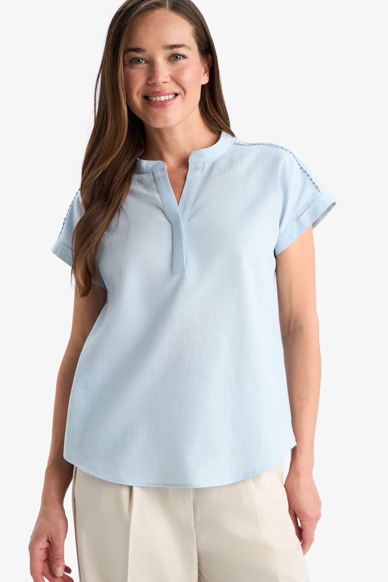 Regular Fit Apaş Yaka Flamlı Pamuk Kısa Kollu Bluz