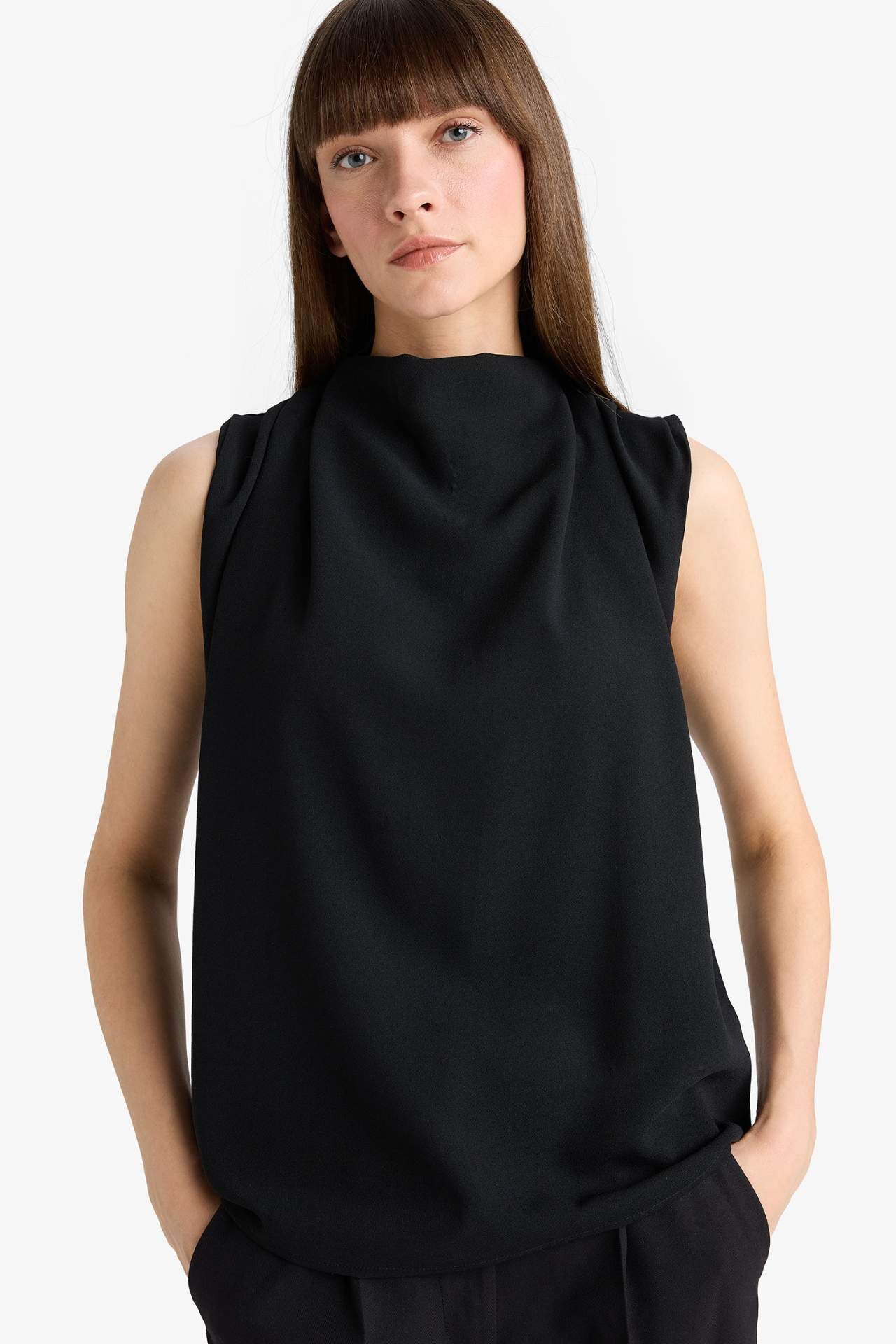 Regular Fit Balıkçı Yaka Krep Kolsuz Bluz