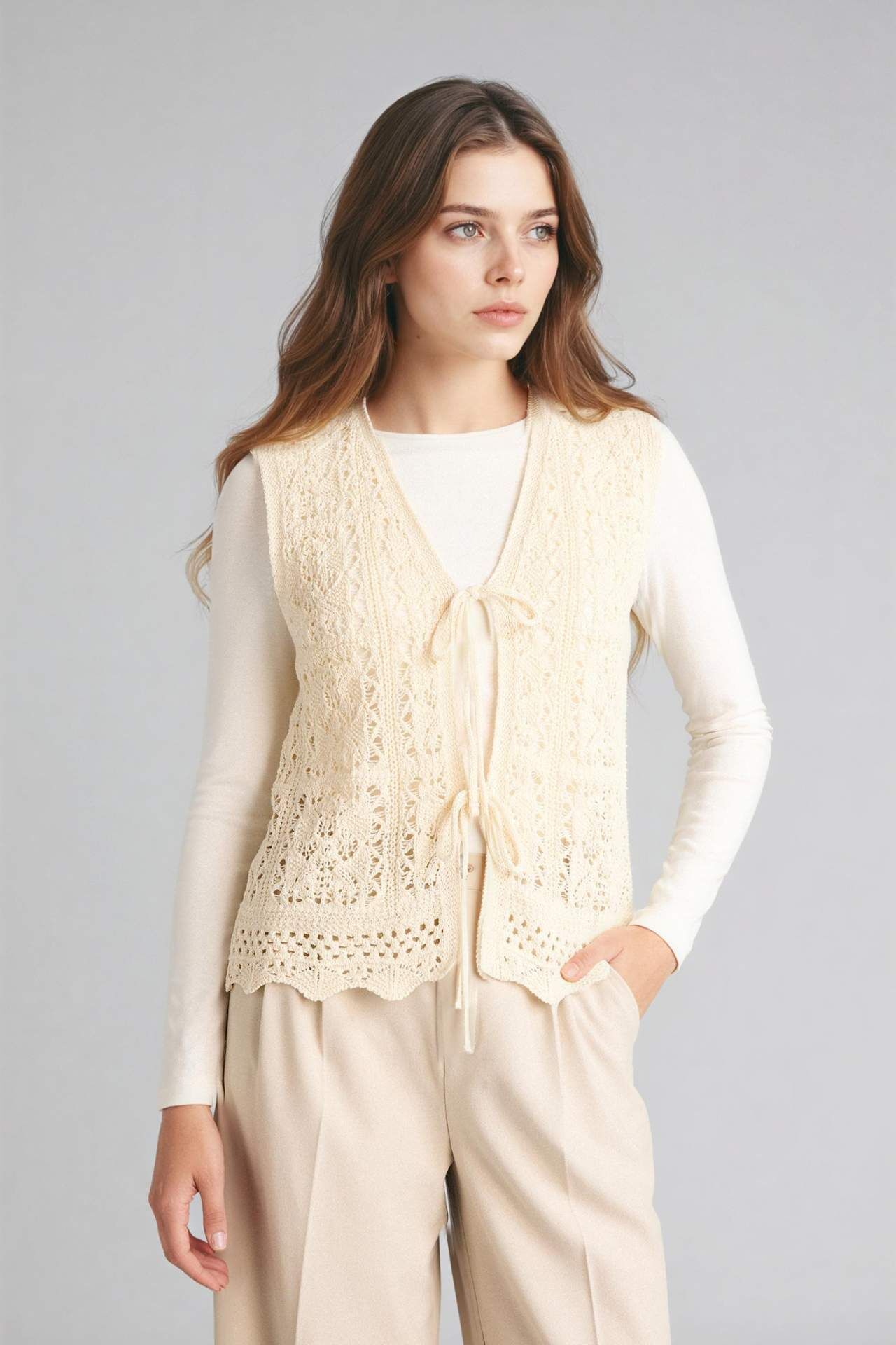 Regular fit ajurlu triko yelek, hafif ve nefes alabilen dokusuyla konforlu bir kullanım sunar. Zarif ajur detaylarıyla her kombine şık bir dokunuş katar. Pamuk 50%,Poliester 50% Manken Bedeni: Göğüs: 88 Boy: 1,72 Basen: 90 Bel: 60
