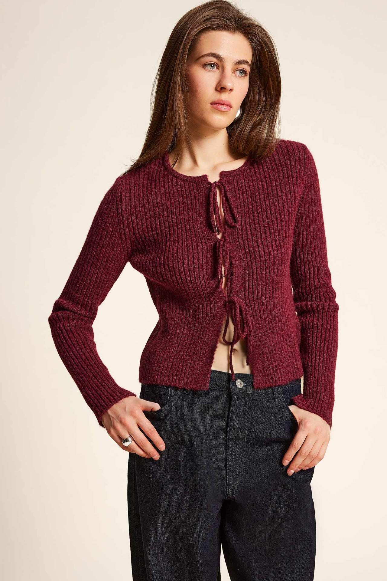 DeFacto Regular Fit Bisiklet Yaka Bağlamalı Basic Düz Triko Bordo Hırka