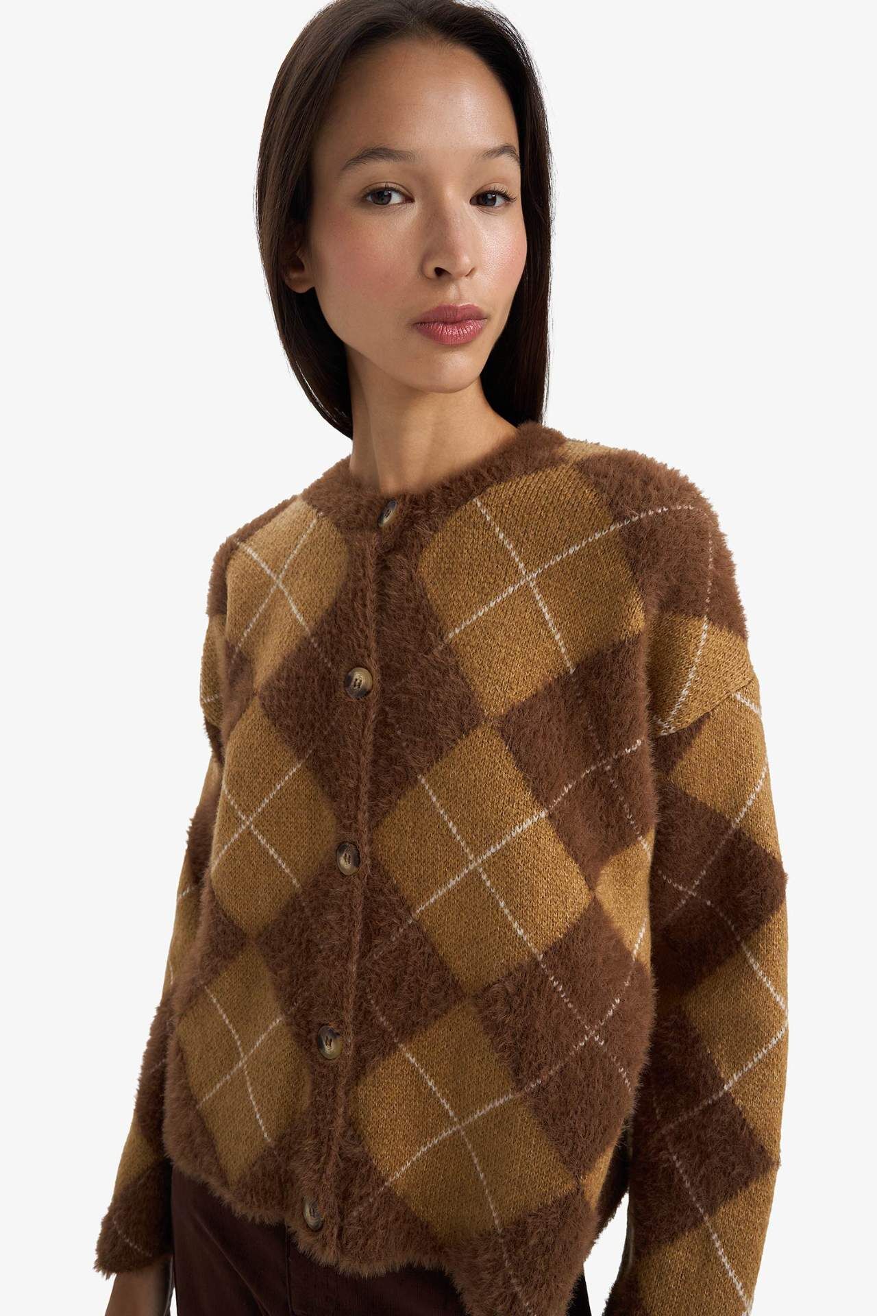 Regular Fit Bisiklet Yaka Baklava Desenli Düğmeli Triko Hırka