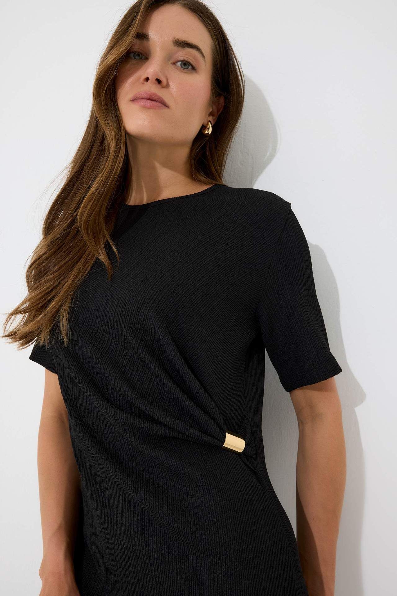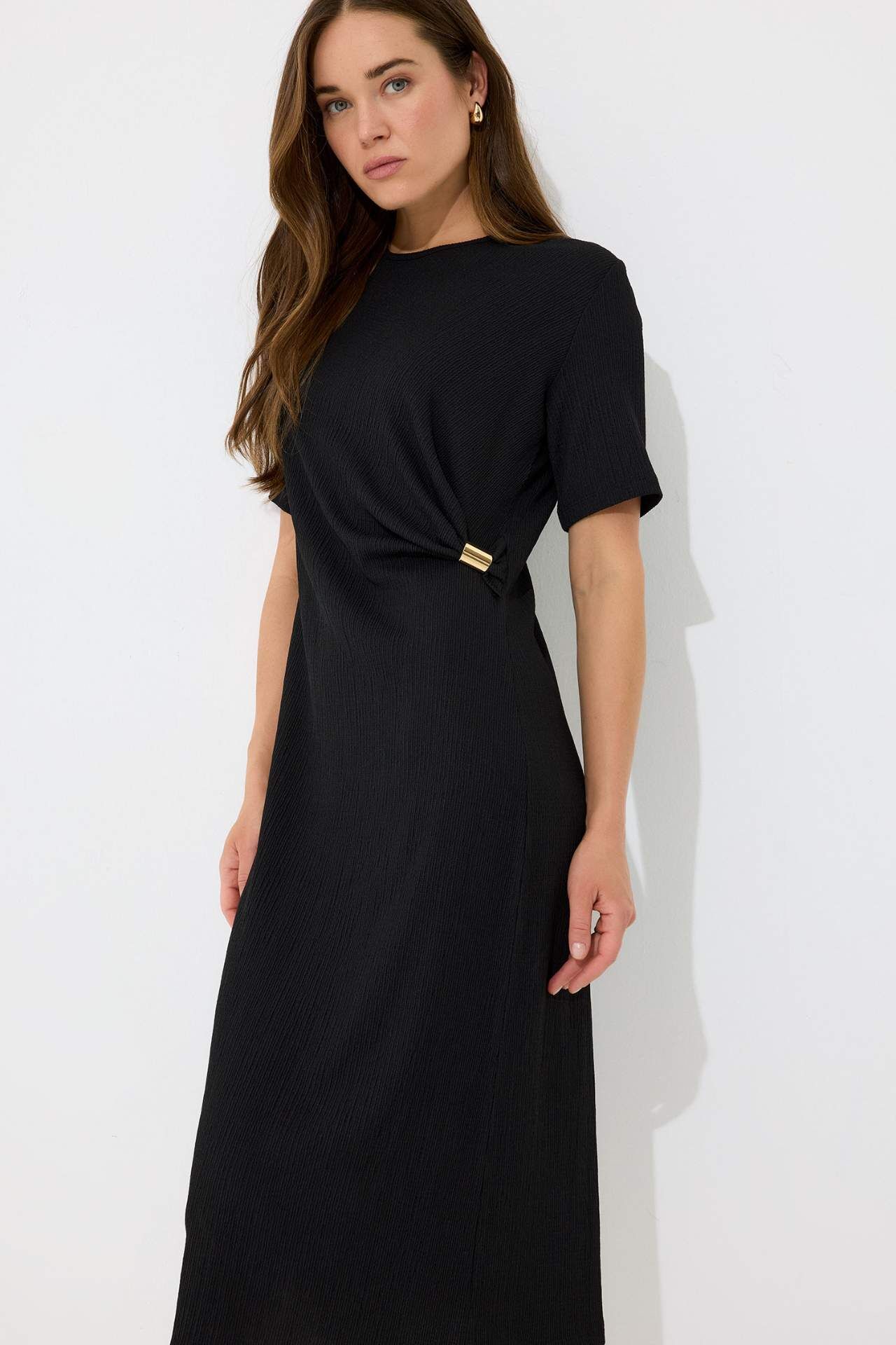 Regular Fit Bisiklet Yaka Basic Düz Bürümcük Kısa Kollu Midi Elbise