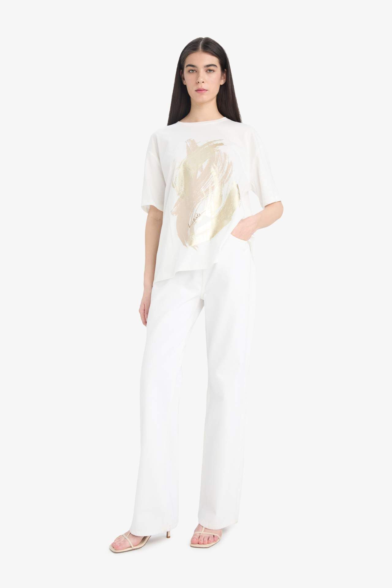 Yetişkin kadınlar için örme kumaştan üretilmiş, regular fit kesime sahip ekru renk baskılı kısa kollu tişört. Bisiklet yaka detayıyla öne çıkan, sürdürülebilir İlkbahar/Yaz koleksiyonundan bir parça. Pamuk 100%,Pamuk 100%,Pamuk 100%,Pamuk 100%,Pamuk 100%,Pamuk 100% Manken Bedeni: Göğüs: 75 Boy: 1,74 Basen: 84 Bel: 56