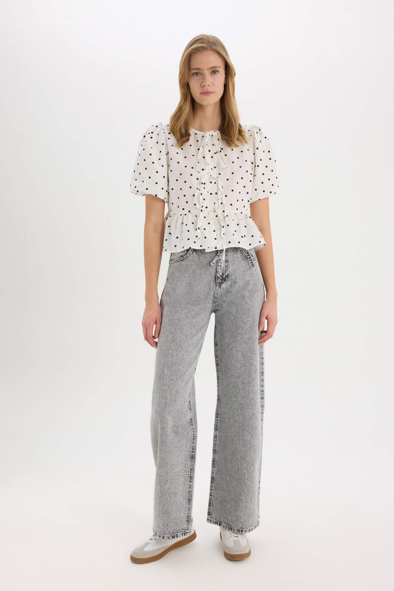 Regular Fit Bisiklet Yaka Baskılı Poplin Kısa Kollu Bluz