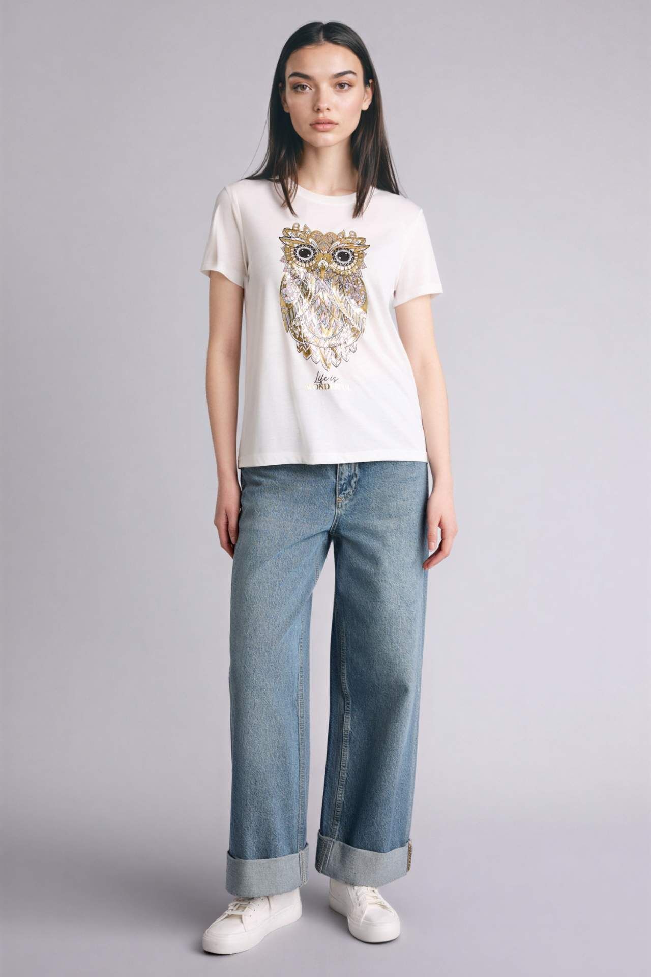 DeFacto Regular Fıt Bisiklet Yaka Baykuş Desenli Kısa Kollu Tişört