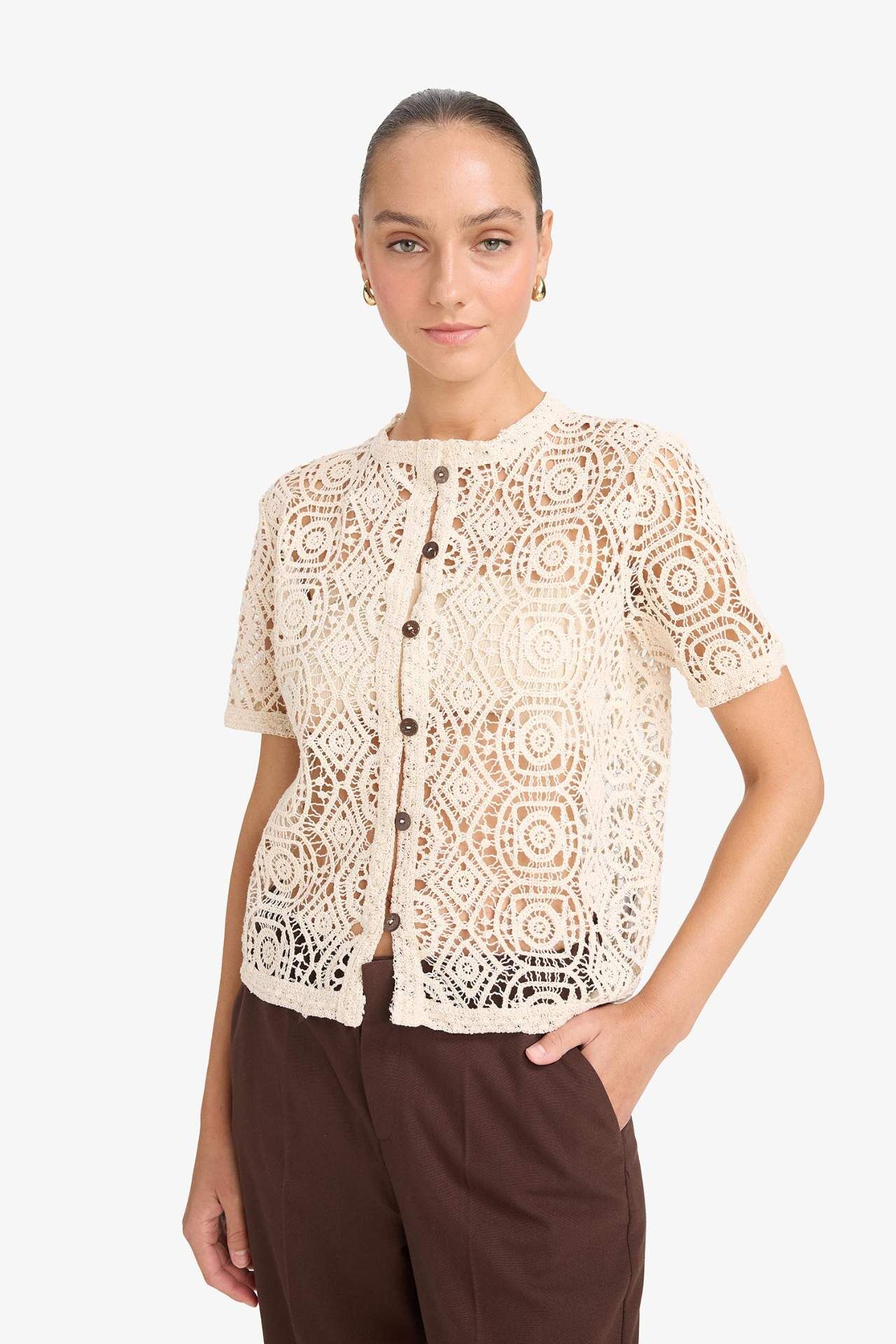 Regular Fit Bisiklet Yaka Brode Kısa Kollu Hırka