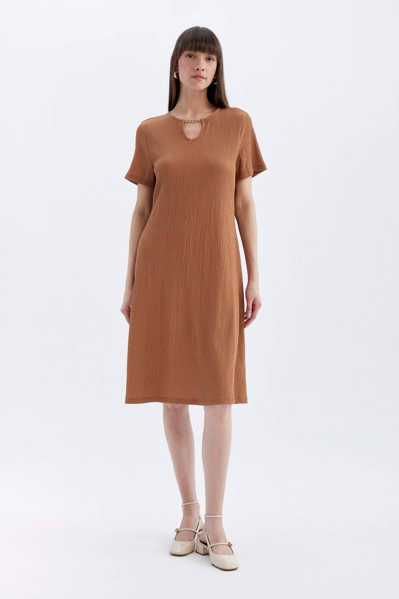 DeFactoFit Regular Fit Bisiklet Yaka Bürümcük Kısa Kollu Midi Elbise
