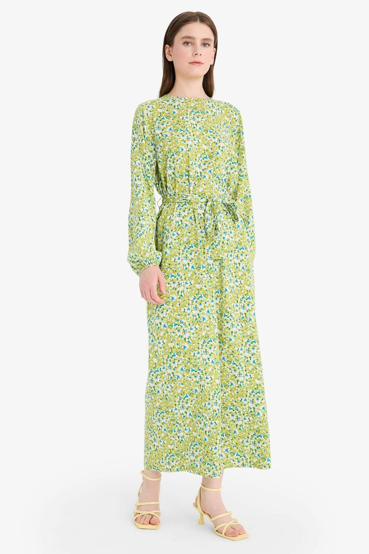 Regular Fit Bisiklet Yaka Çiçek Desenli Uzun Kollu Maxi Elbise