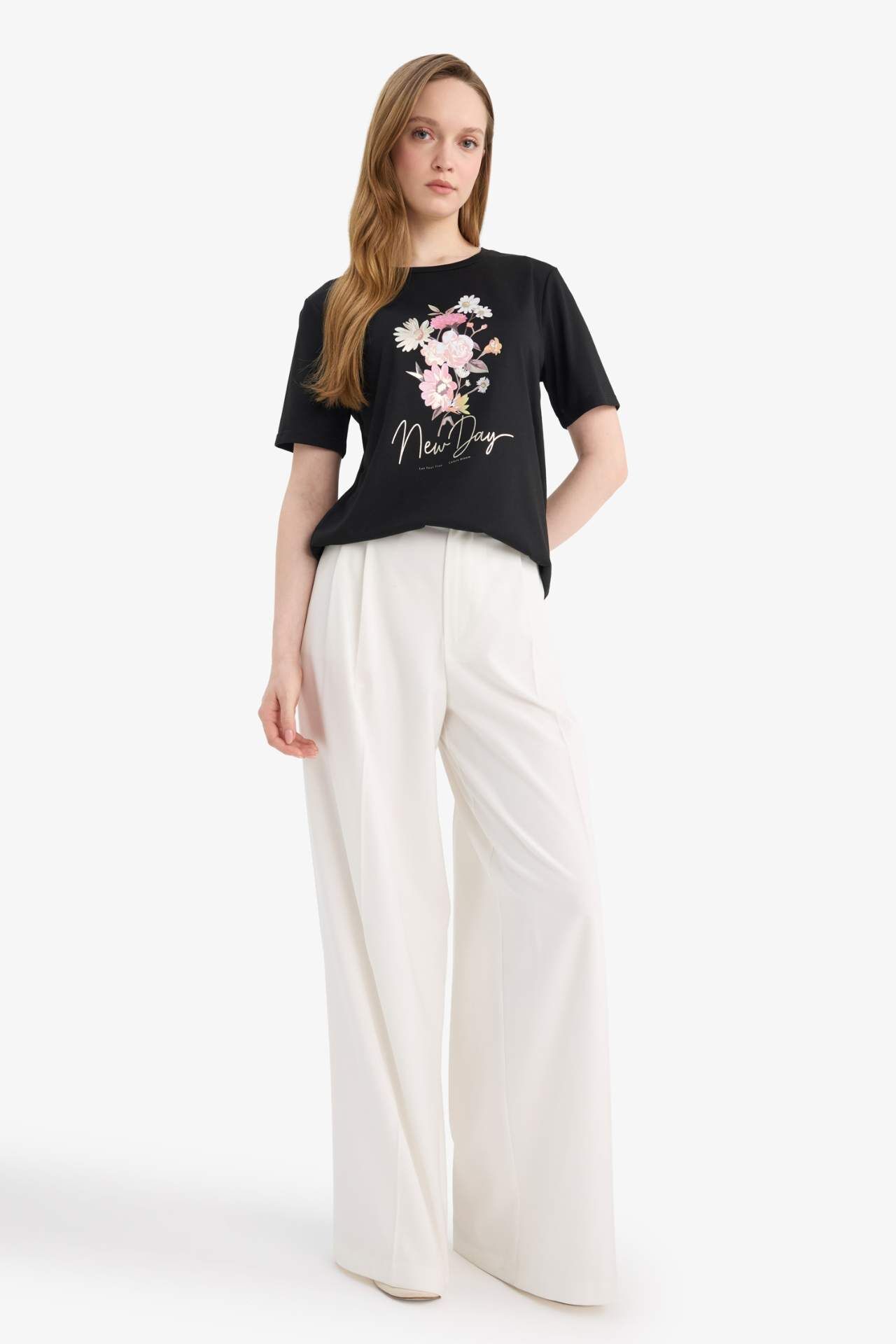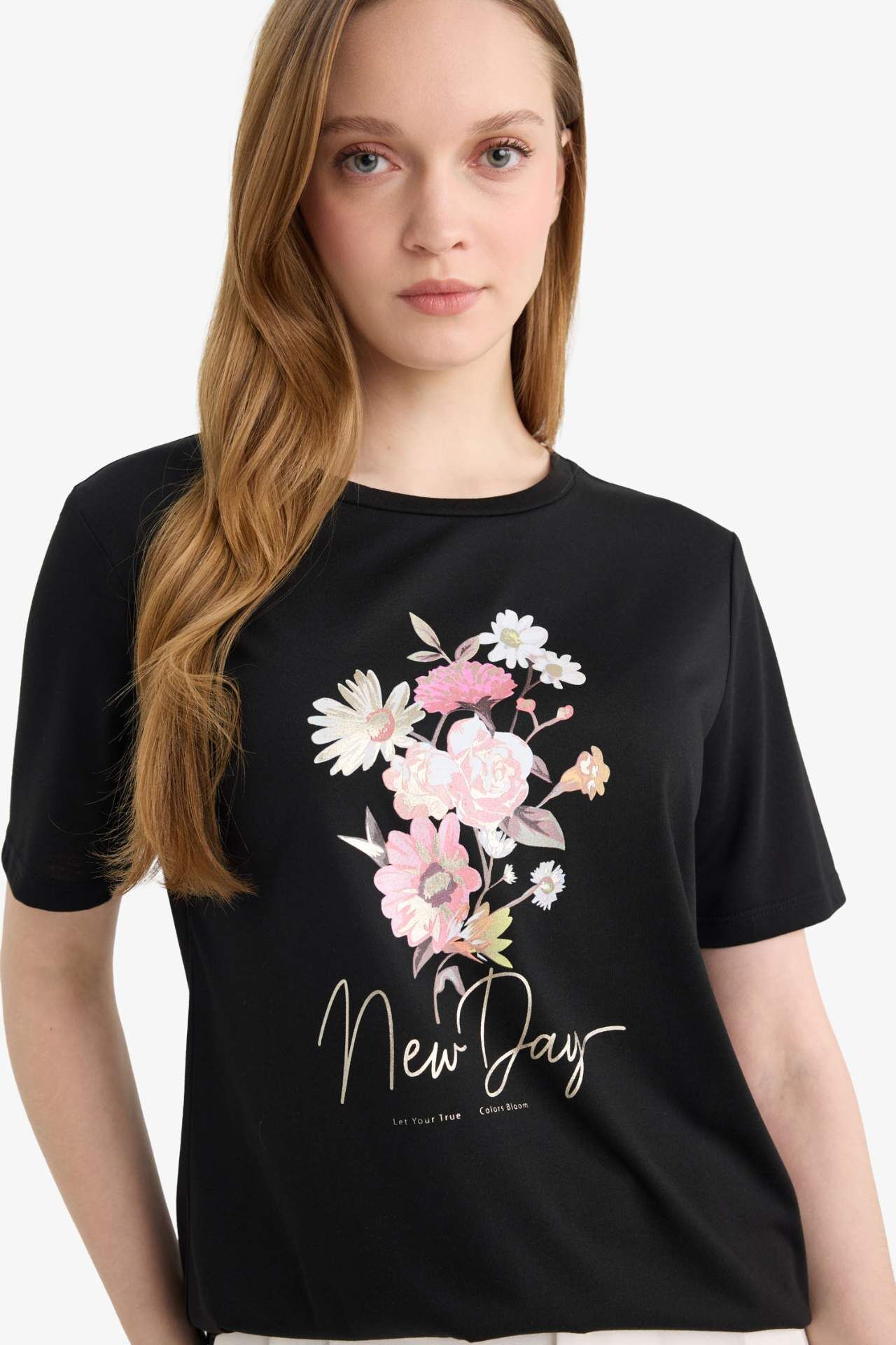 Regular Fit Bisiklet Yaka Çiçekli Kısa Kollu Tişört