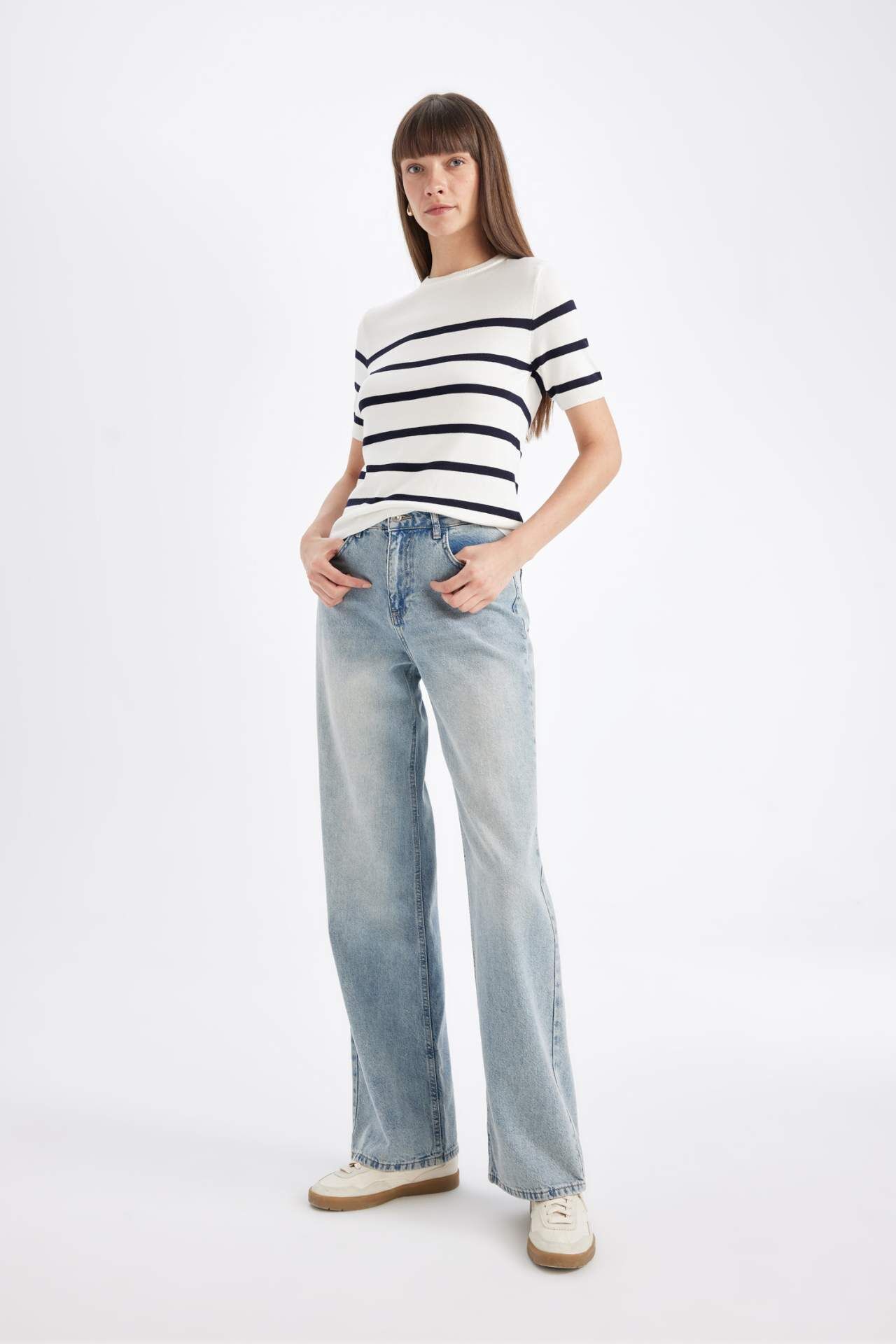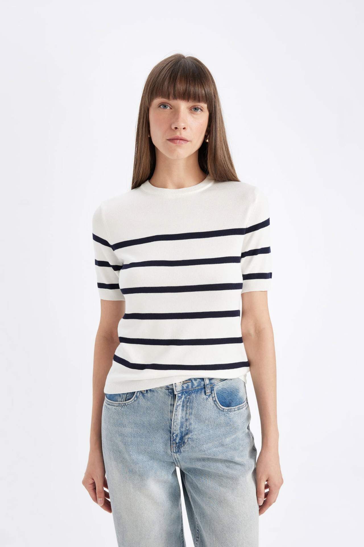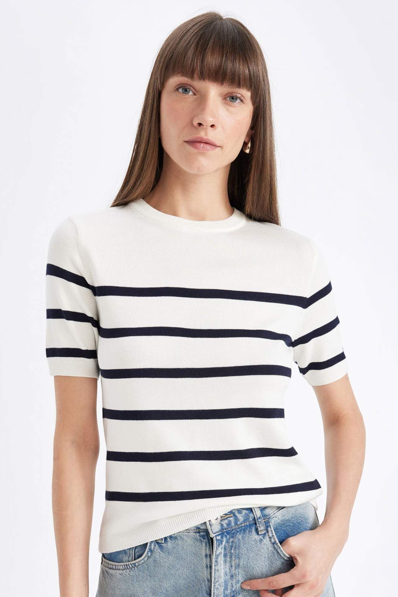 DeFactoFit Regular Fit Bisiklet Yaka Çizgili Kısa Kollu Kazak
