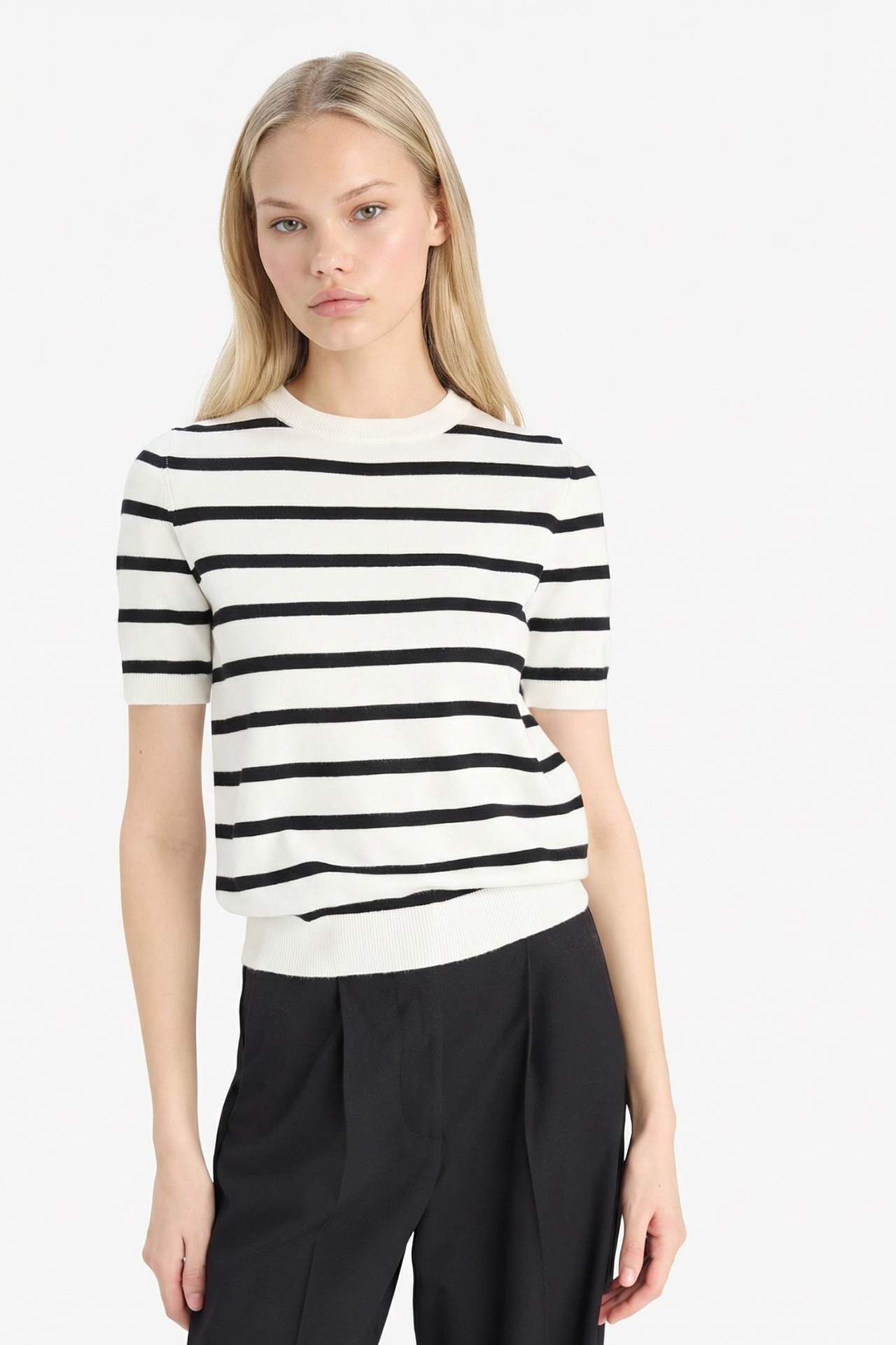 Regular fit bisiklet yaka çizgili kısa kollu kazak, sade ve modern çizgili deseniyle günlük şıklığa zarif bir dokunuş katar. Hafif yapısıyla mevsim geçişlerinde rahatlıkla tercih edilebilir. Viskoz 69%,Naylon 31%,Viskoz 69%,Naylon 31%,Viskoz 69%,Naylon 31%,Viskoz 69%,Naylon 31% Manken Bedeni: Göğüs: 82 Boy: 1,73 Basen: 89 Bel: 60