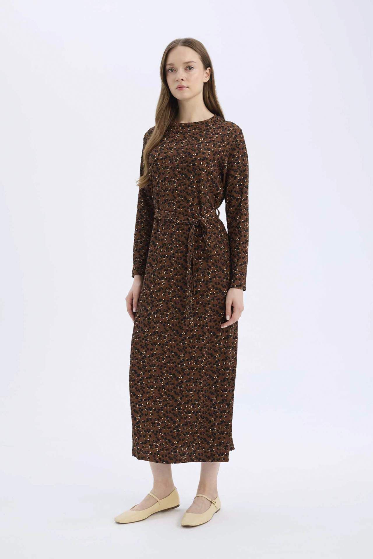 Regular Fit Bisiklet Yaka Desenli Uzun Kollu Bürümcük Maxi Elbise