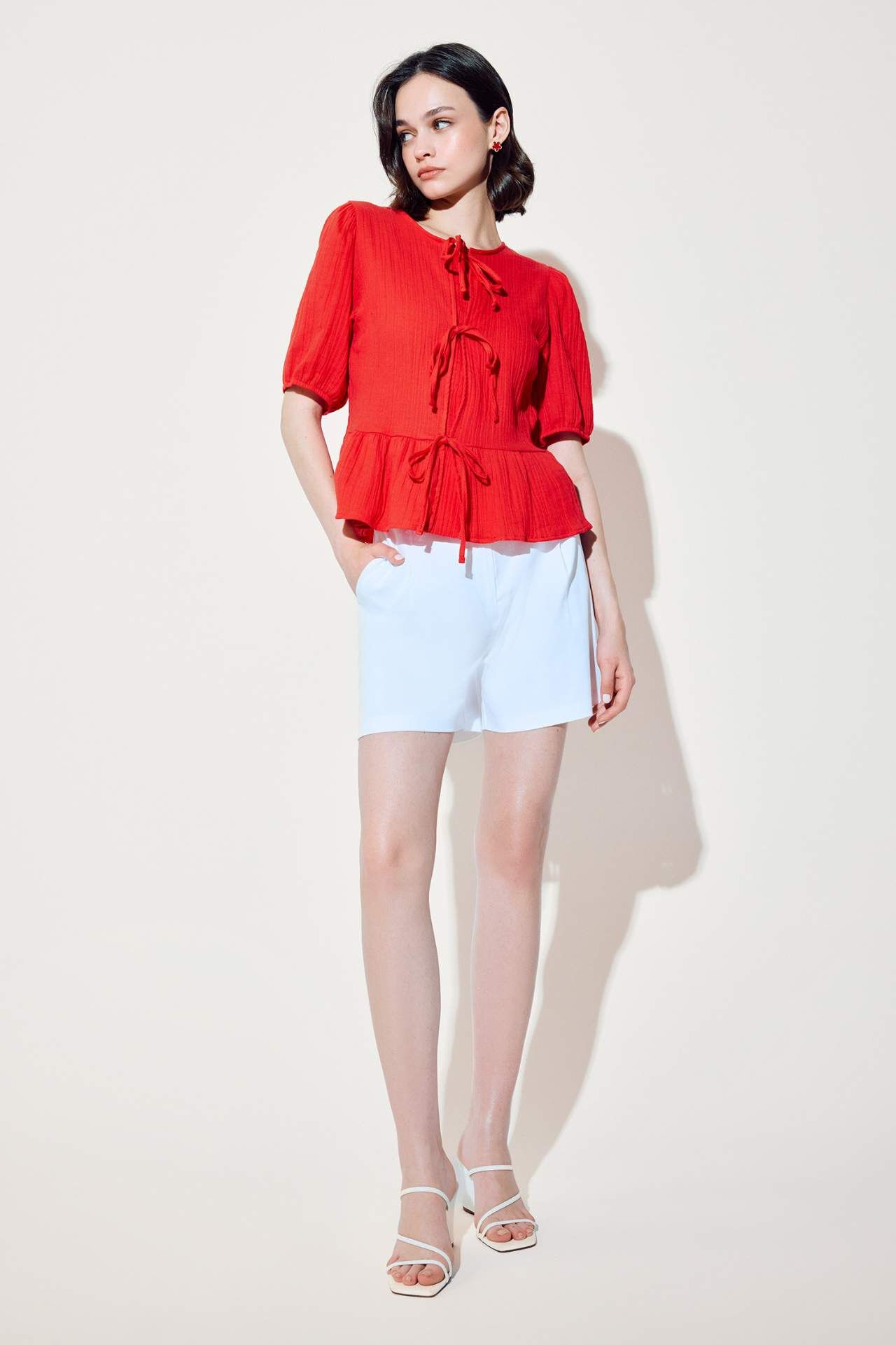 Kadınlar için kısa kollu kırmızı bluz. Dokulu kumaş ve balon kollu detayıyla şık bir görünüm sunar. İlkbahar/Yaz sezonuna uygun olan bu bluz, günlük kullanıma uygundur. Bisiklet yaka ve regular fit kesimi ile rahatlık ve tarzı bir arada sunar. Pamuk 99%,Elastan 1%,Pamuk 99%,Elastan 1%,Pamuk 99%,Elastan 1%,Pamuk 99%,Elastan 1%,Pamuk 99%,Elastan 1%,Pamuk 99%,Elastan 1% Manken Bedeni: Göğüs: 84 Boy: 1,76 Basen: 90 Bel: 61