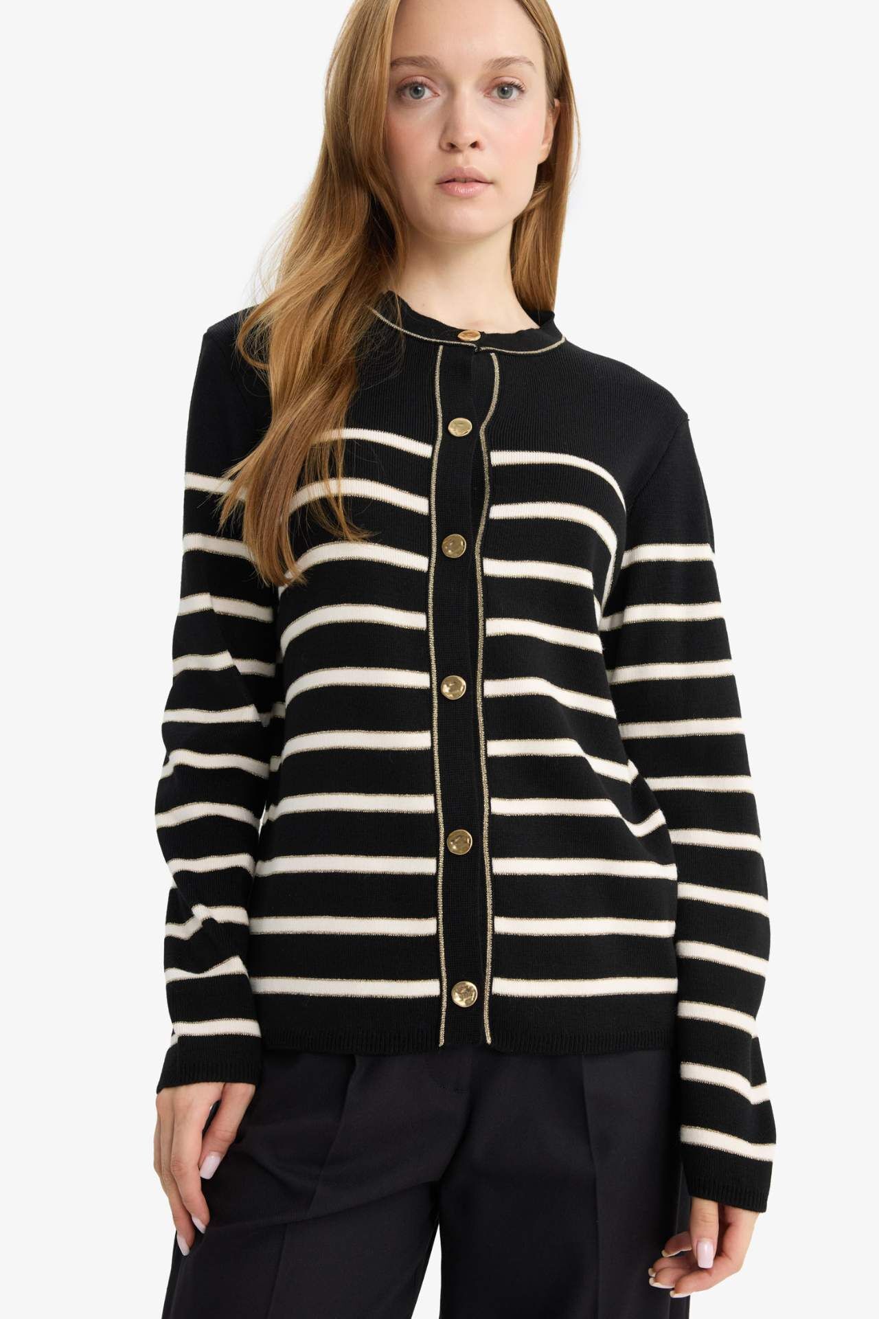 DeFacto Regular Fit Bisiklet Yaka Düğmeli Çizgili Triko Hırka
