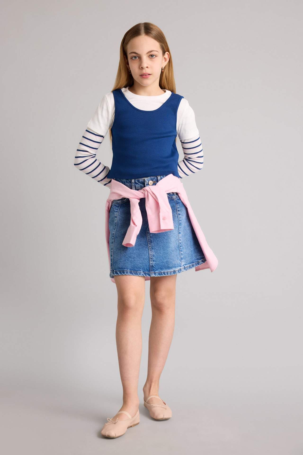 DeFacto Regular Fıt Bisiklet Yaka Fitilli Kaşkorse Uzun Kollu Tişört Kız Çocuk