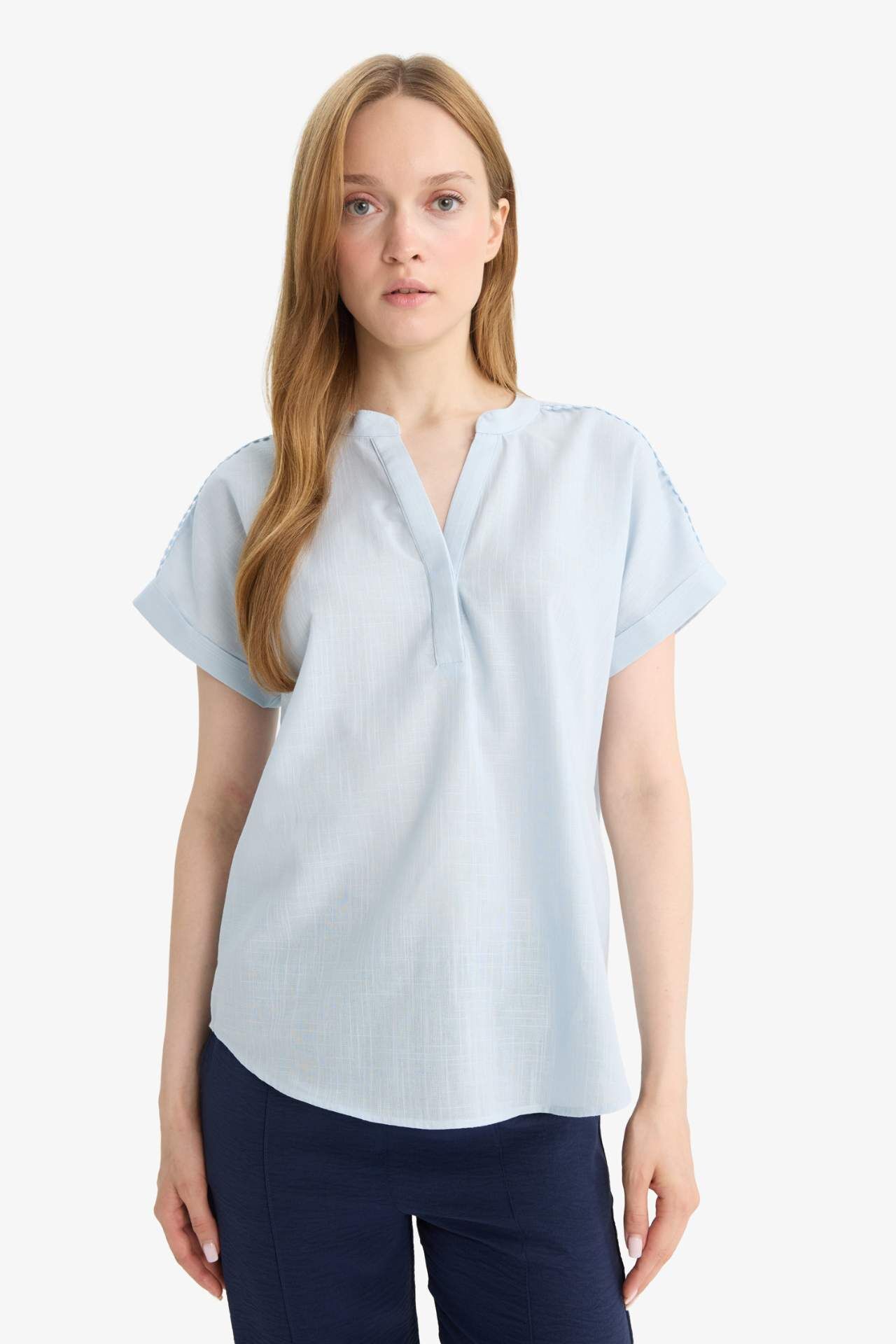 Flamlı pamuk kumaşıyla hafif ve nefes alabilen bir yapı sunan bisiklet yaka bluz, yaz günleri için ideal bir tercihtir. Regular fit kesimiyle sade ve şık bir görünüm sağlar. Pamuk 100%,Pamuk 100%,Pamuk 100%,Pamuk 100%,Pamuk 100%,Pamuk 100%,Pamuk 100%,Pamuk 100%,Pamuk 100% Manken Bedeni: Göğüs: 84 Boy: 1,74 Basen: 92 Bel: 61