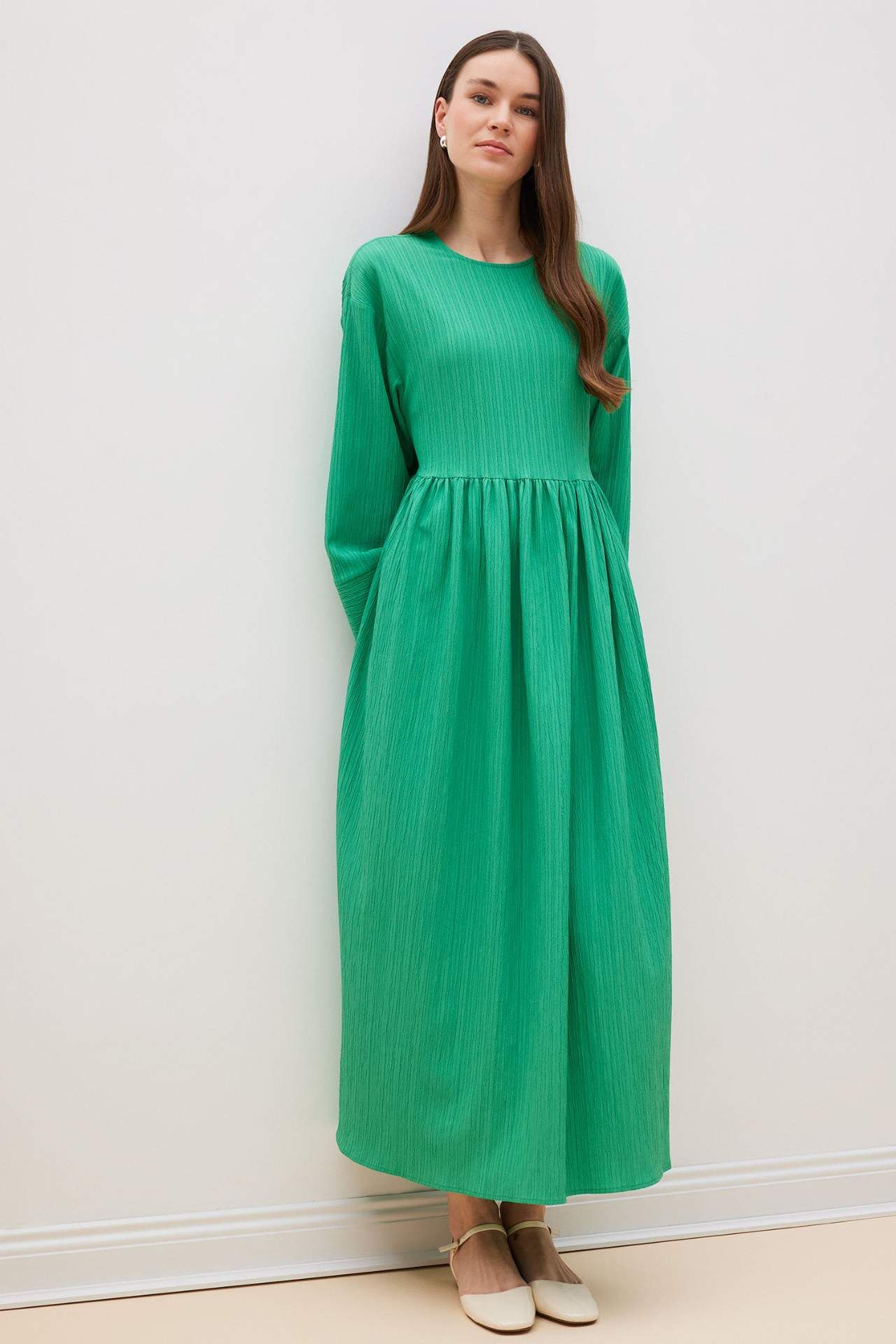 Regular Fit Bisiklet Yaka Gofre Dokulu Uzun Kollu Maxi Elbise