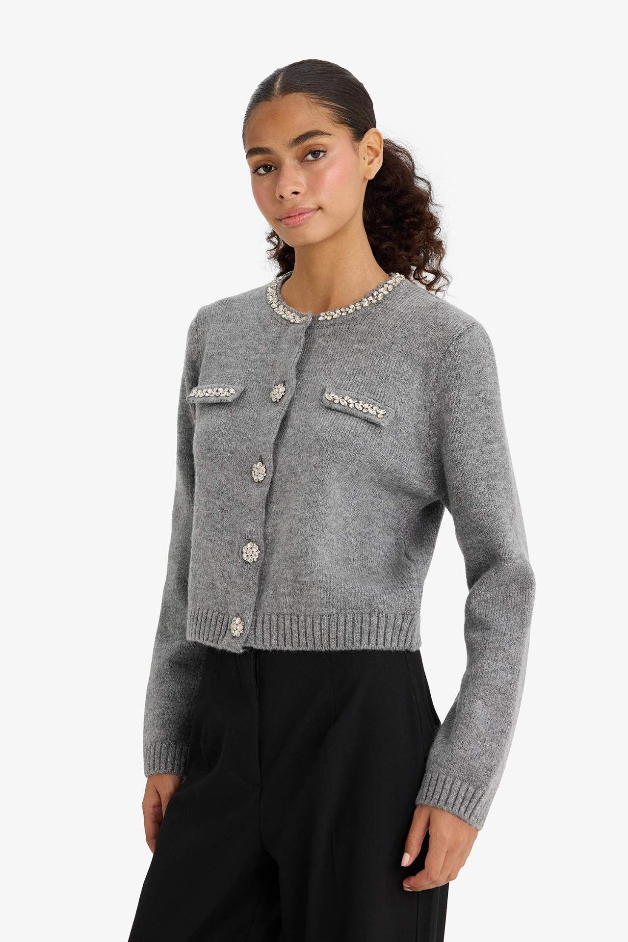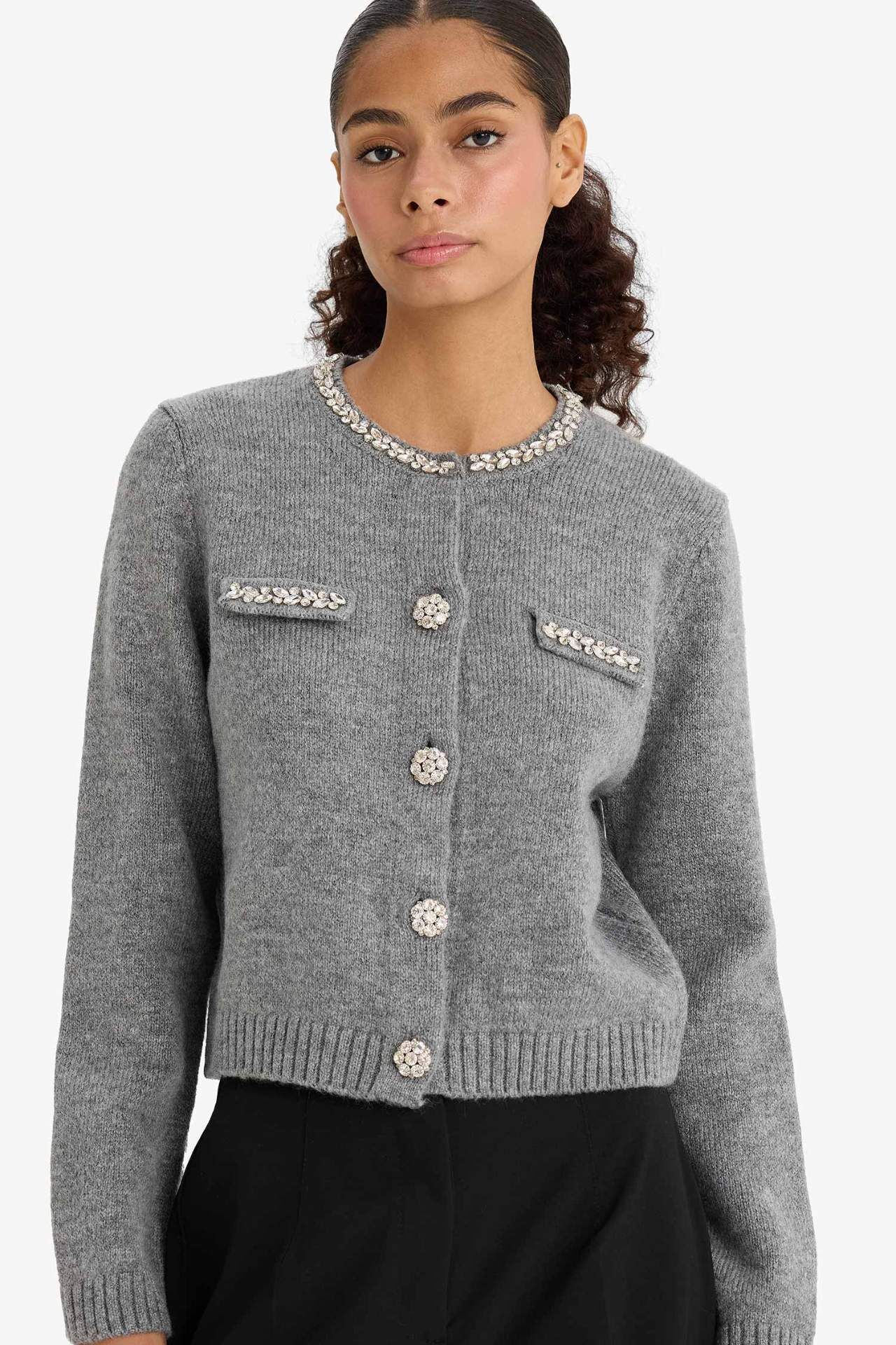 DeFacto Regular Fit Bisiklet Yaka İşlemeli Hırka F3896AX25WNGR76