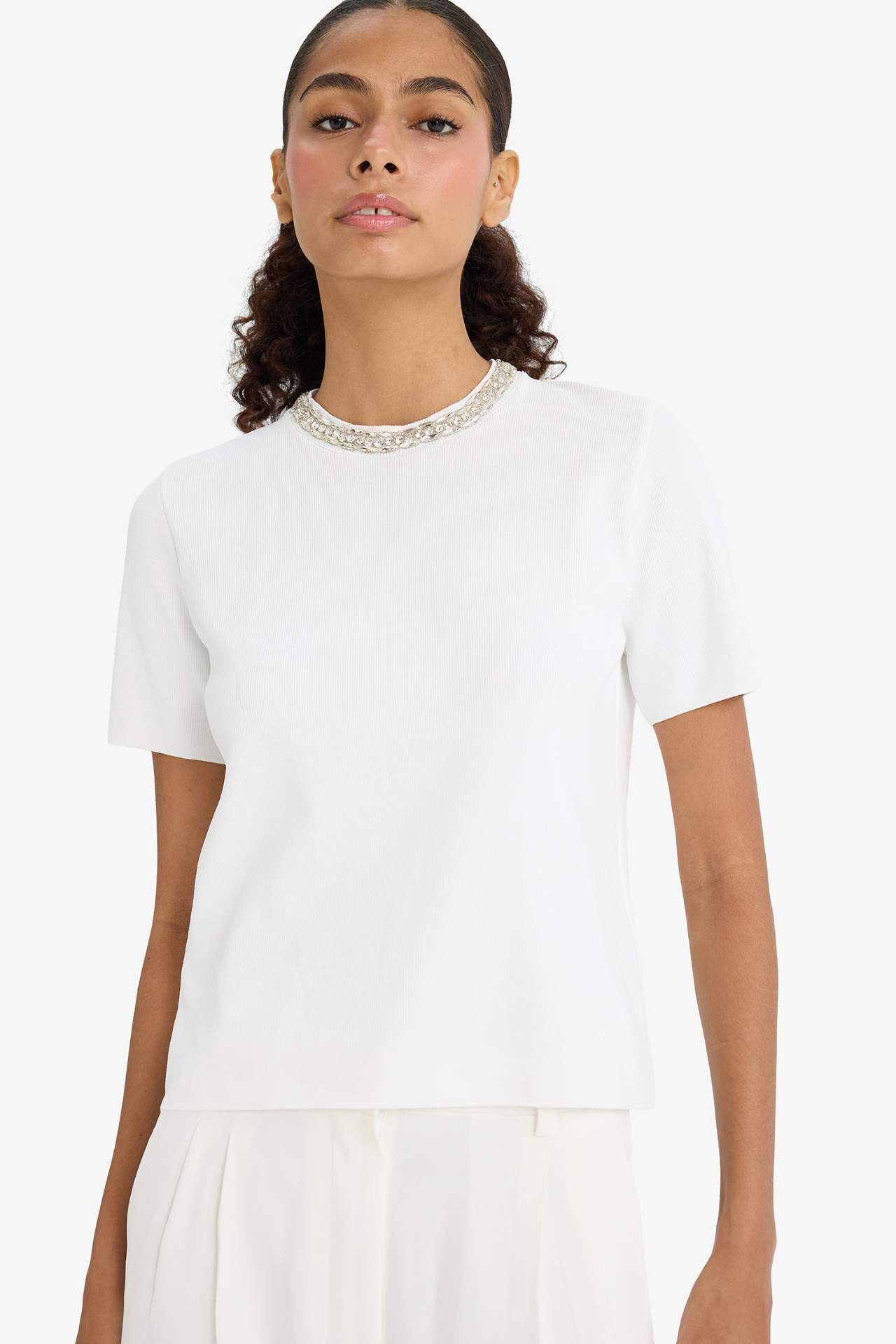 Regular Fit Bisiklet Yaka İşlemeli Krep Kısa Kollu Kazak