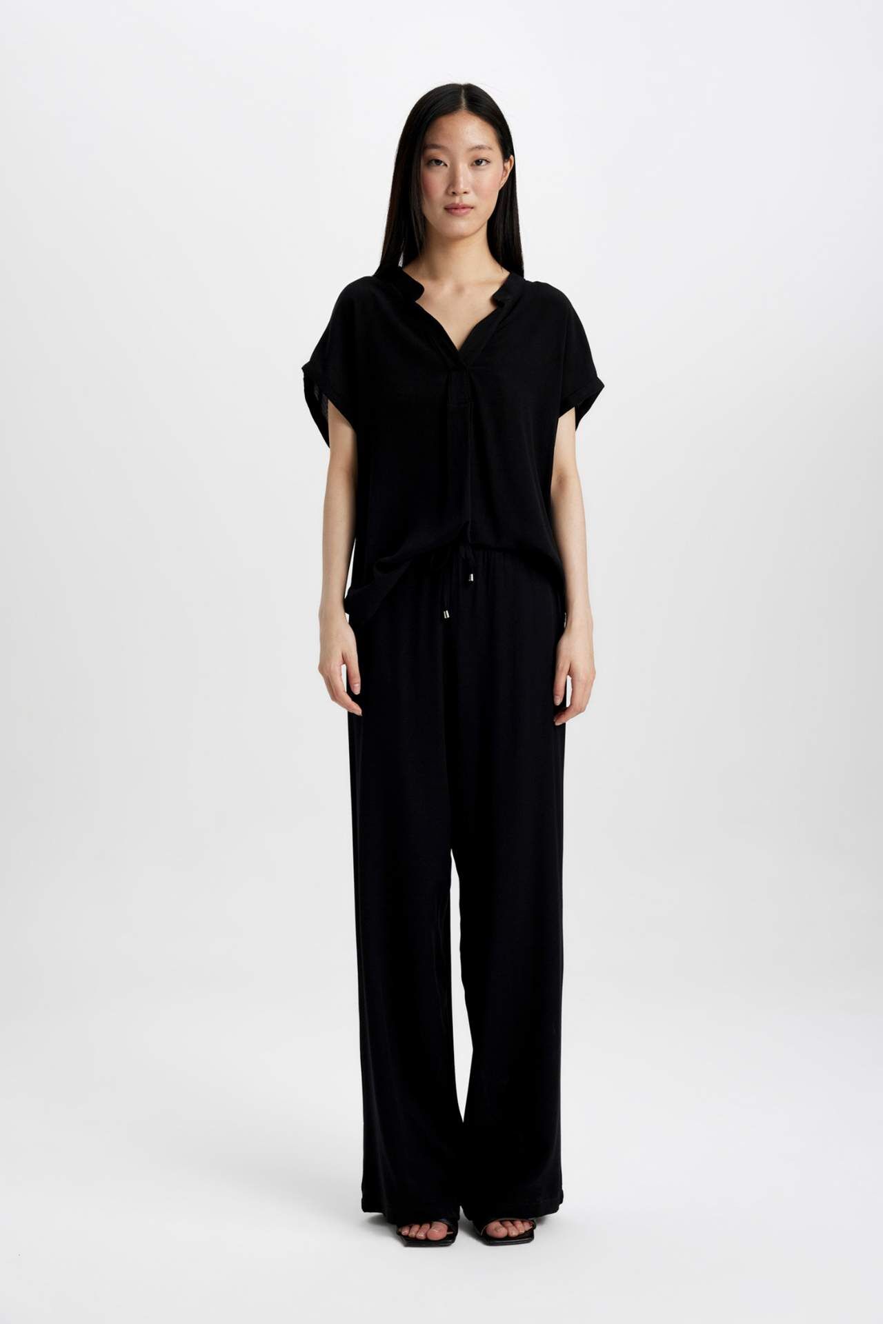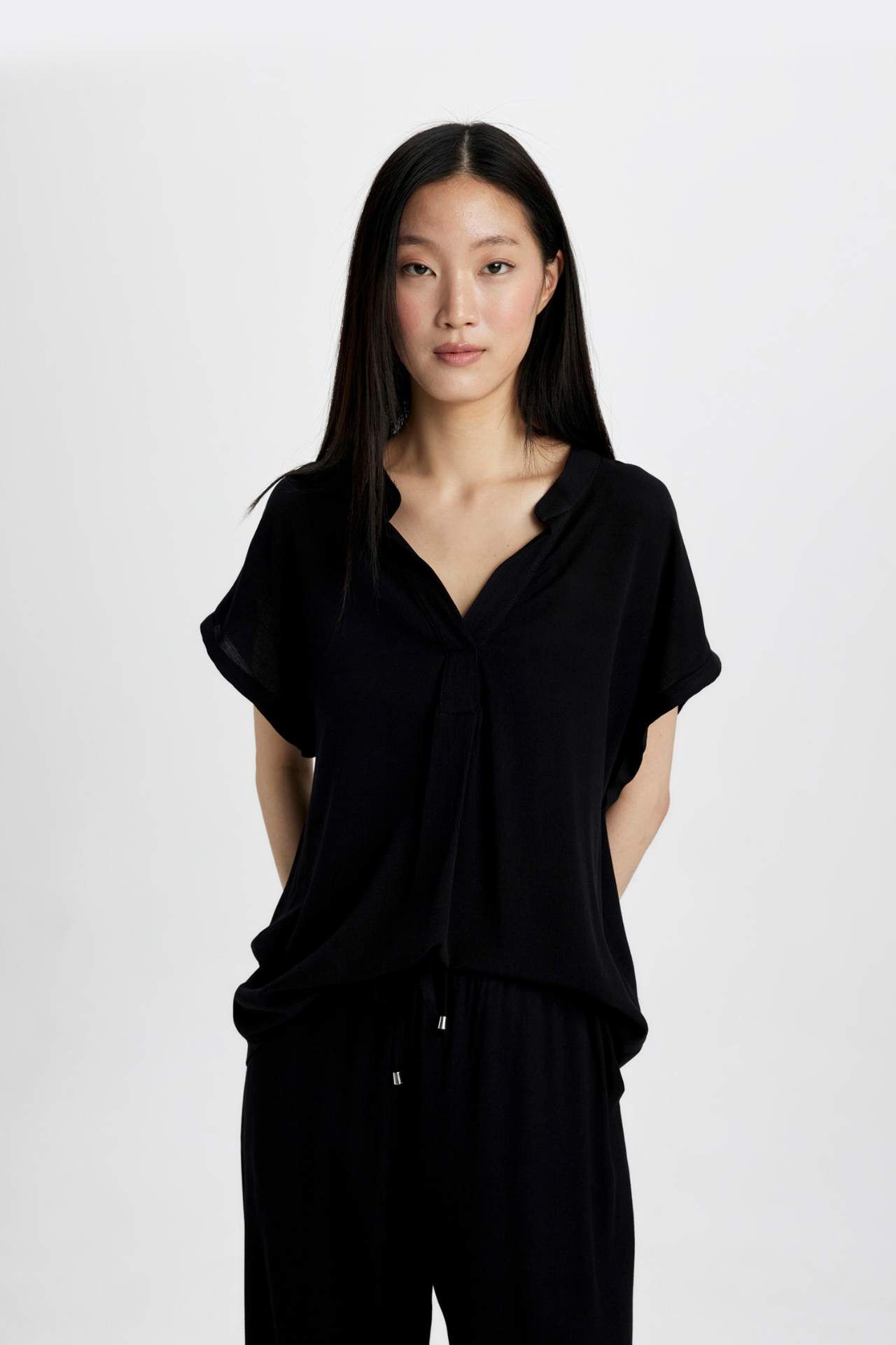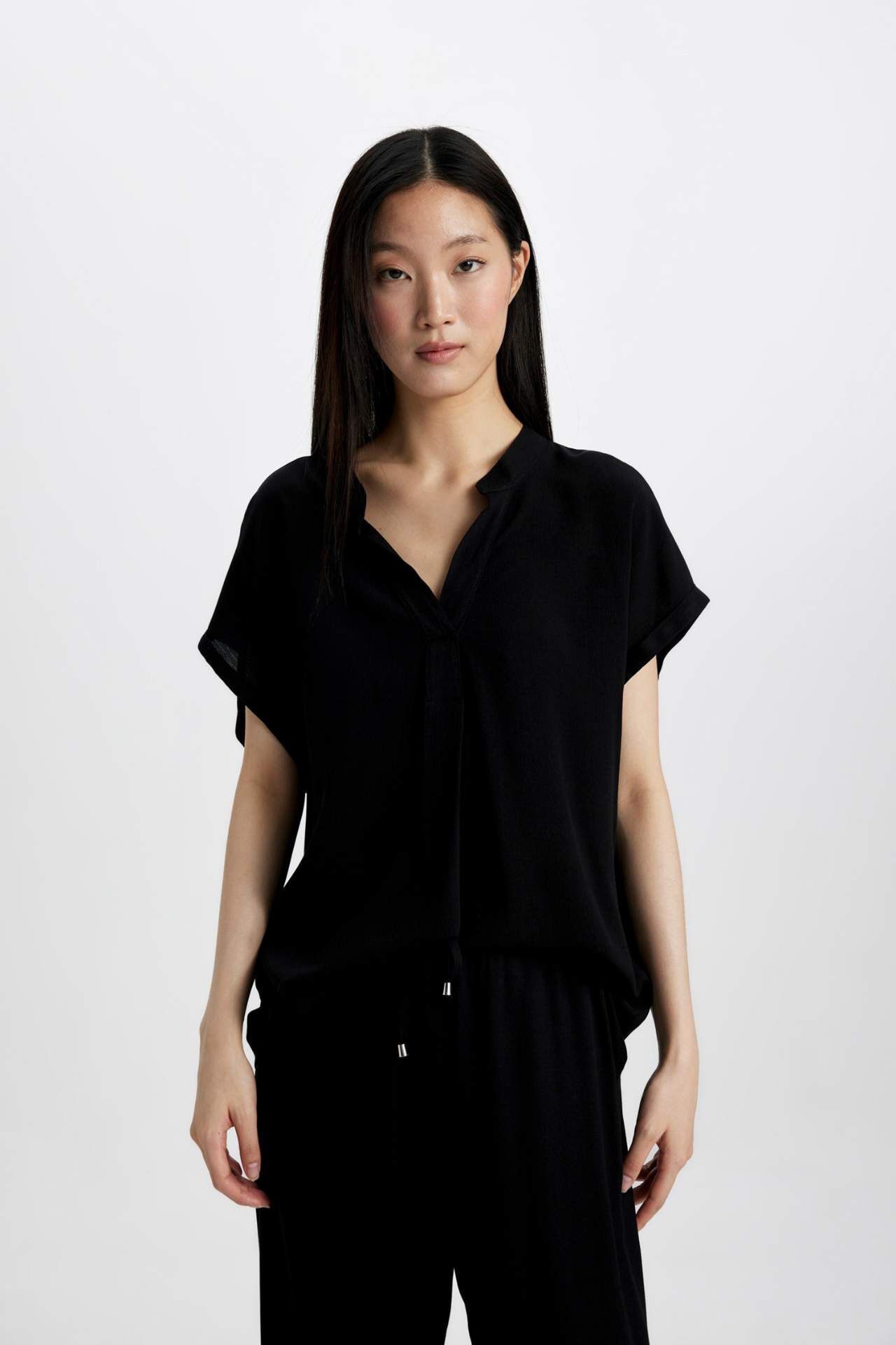 DeFacto Regular Fit Bisiklet Yaka Krinkıl Kumaş Kısa Kollu Bluz