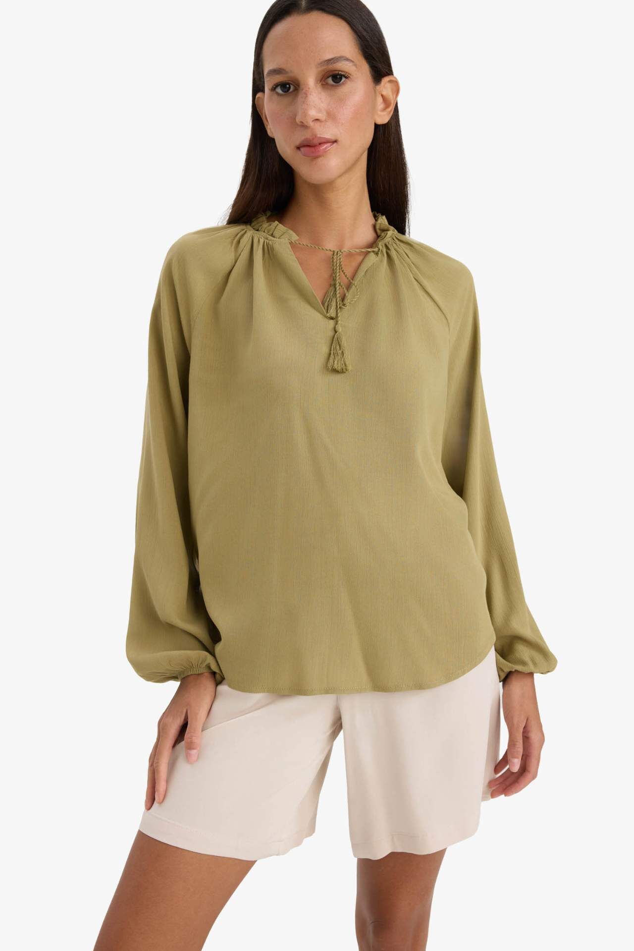Bu krinkıl kumaştan yapılmış uzun kollu haki bluz, ilkbahar ve yaz mevsimleri için idealdir. Regular fit kalıbı ve bisiklet yaka detayıyla şık ve rahat bir görünüm sunar. Reglan kollu ve düz paça detaylarıyla dikkat çeker. Dokuma üst kategorisindeki kadınlar için temel bir parçadır. Viskoz 100%,Viskoz 100%,Viskoz 100%,Viskoz 100%,Viskoz 100%,Viskoz 100%,Viskoz 100%,Viskoz 100%,Viskoz 100%,Viskoz 100%,Viskoz 100%,Viskoz 100% Manken Bedeni: Göğüs: 85 Boy: 1,79 Basen: 90 Bel: 60