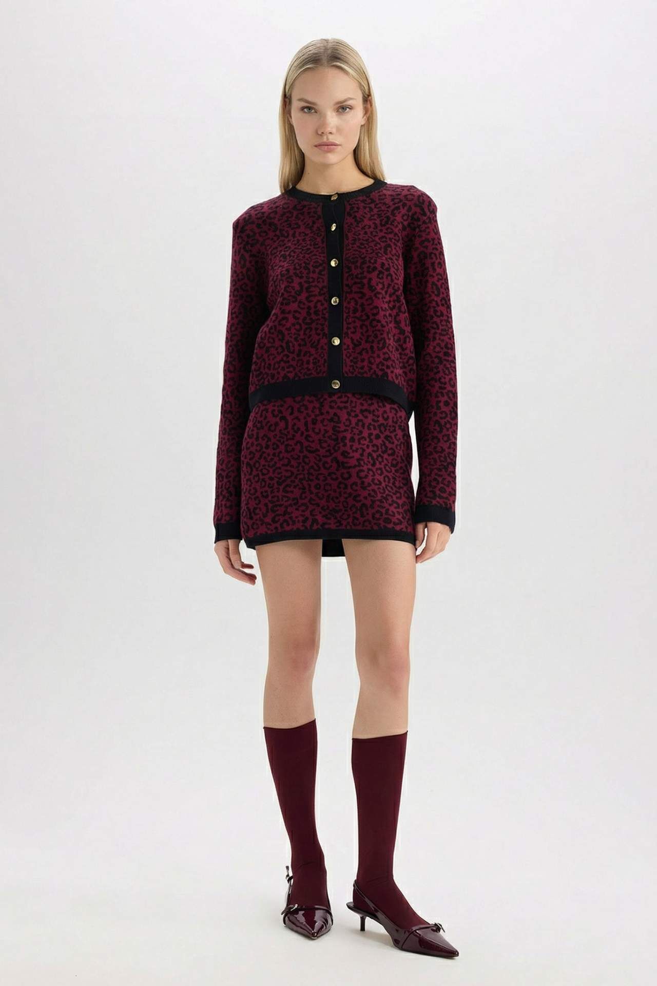 Regular Fit Bisiklet Yaka Leopar Desenli Düğme Kapamalı Triko Hırka