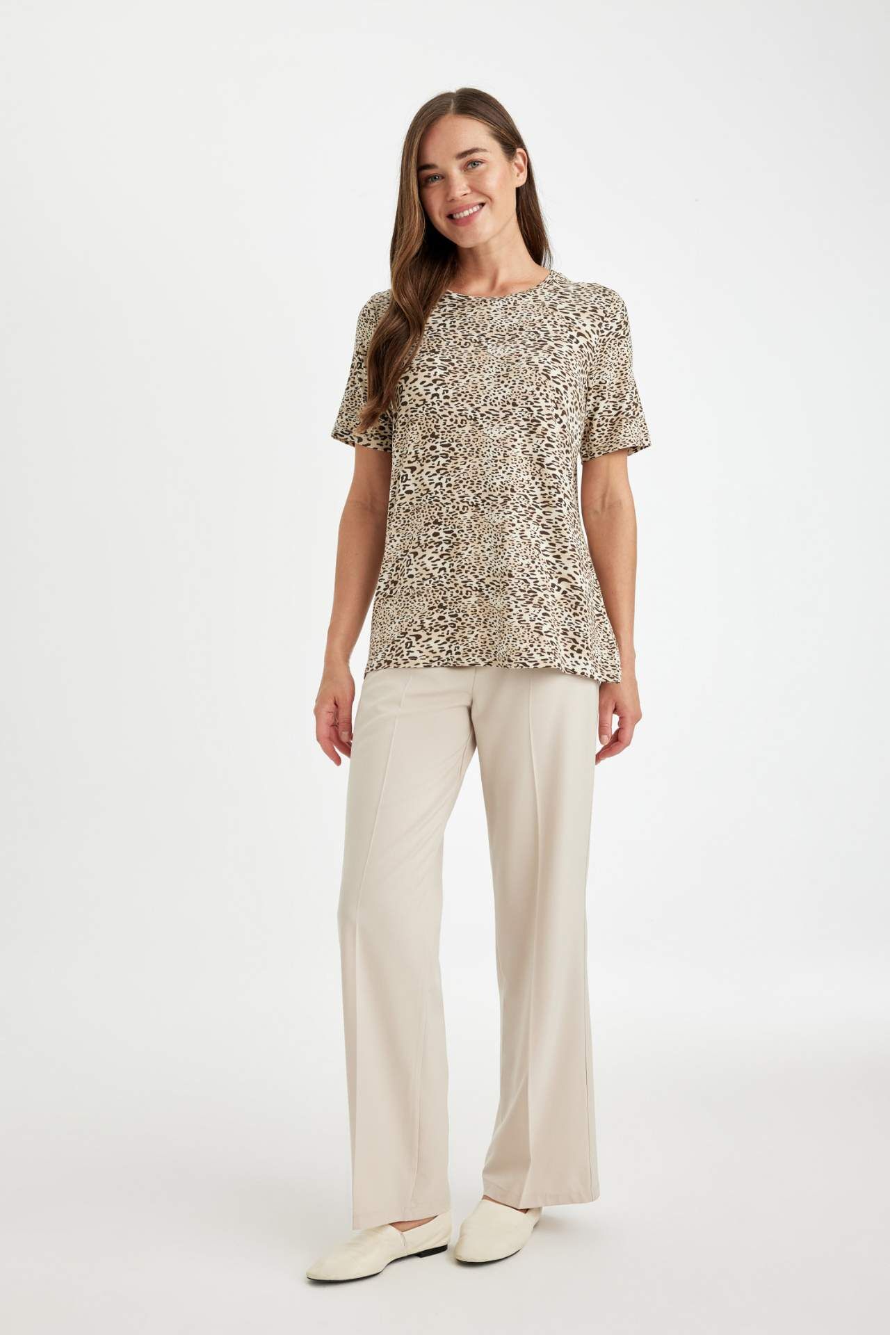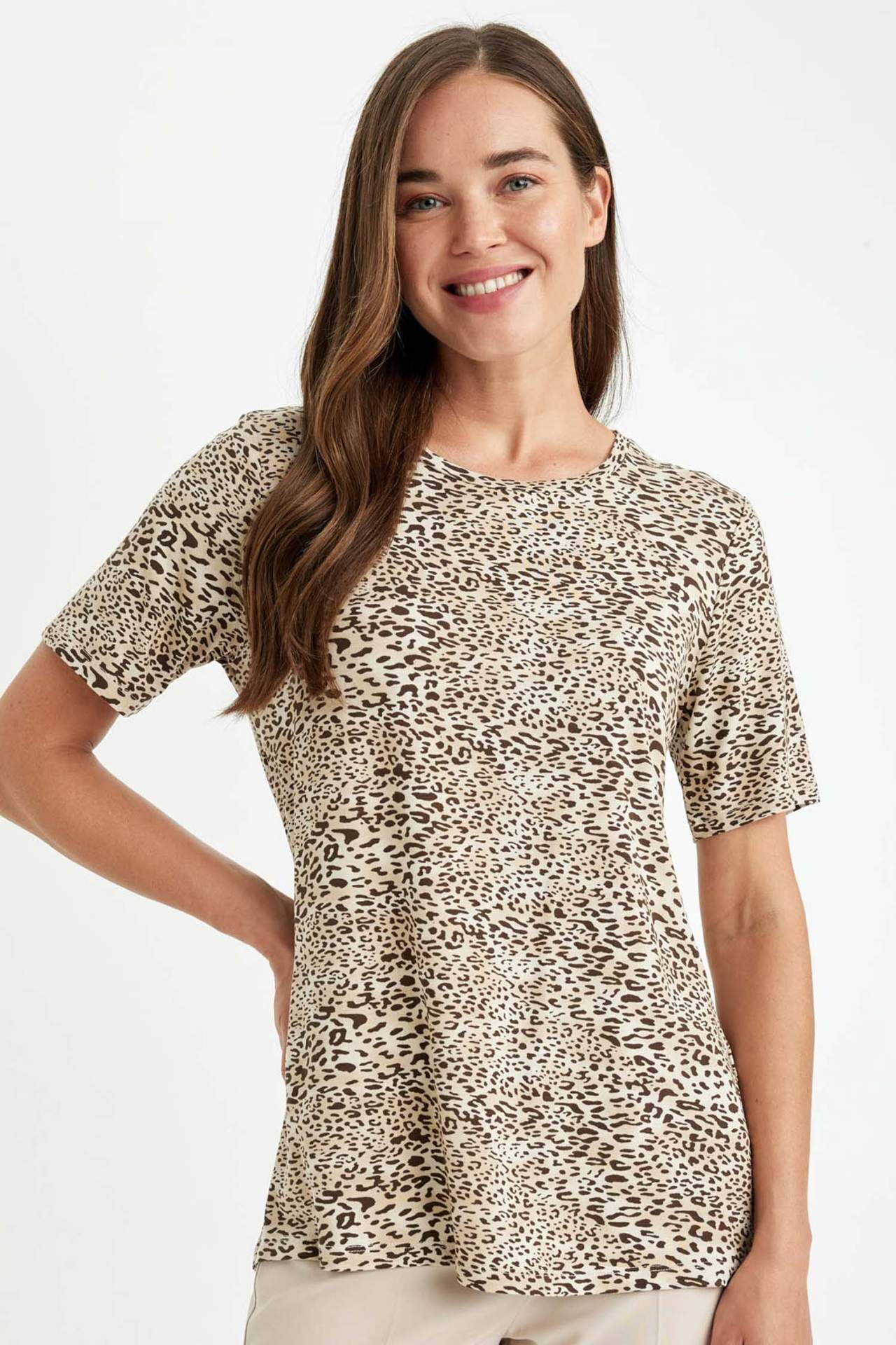DeFacto Regular Fit Bisiklet Yaka Leopar Desenli Kısa Kollu Tişört