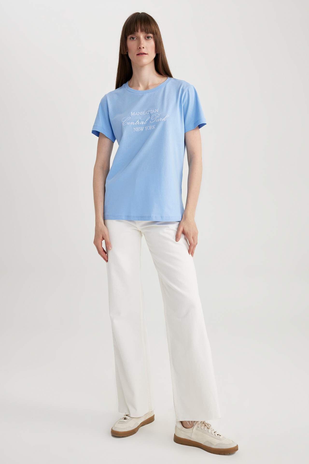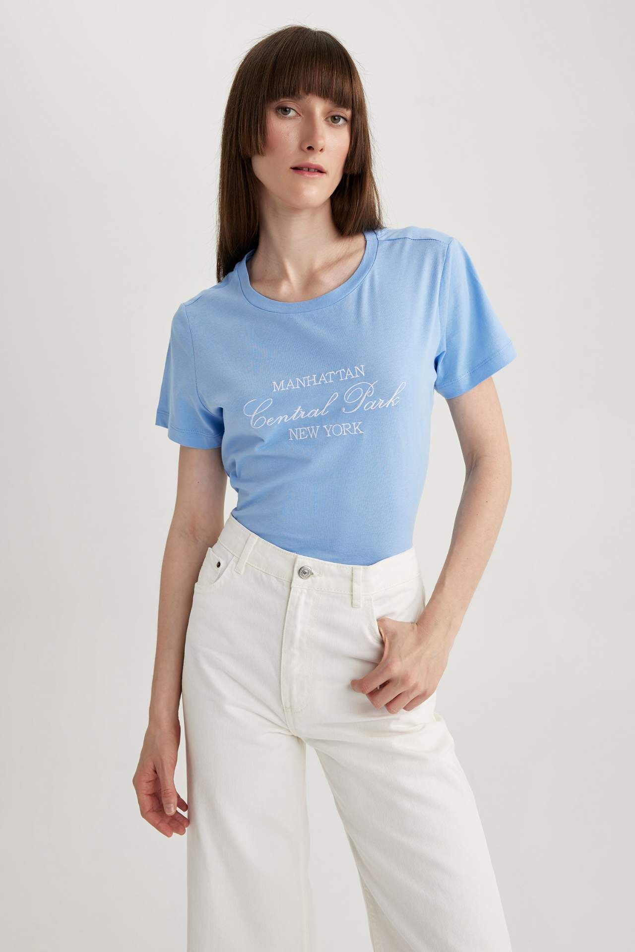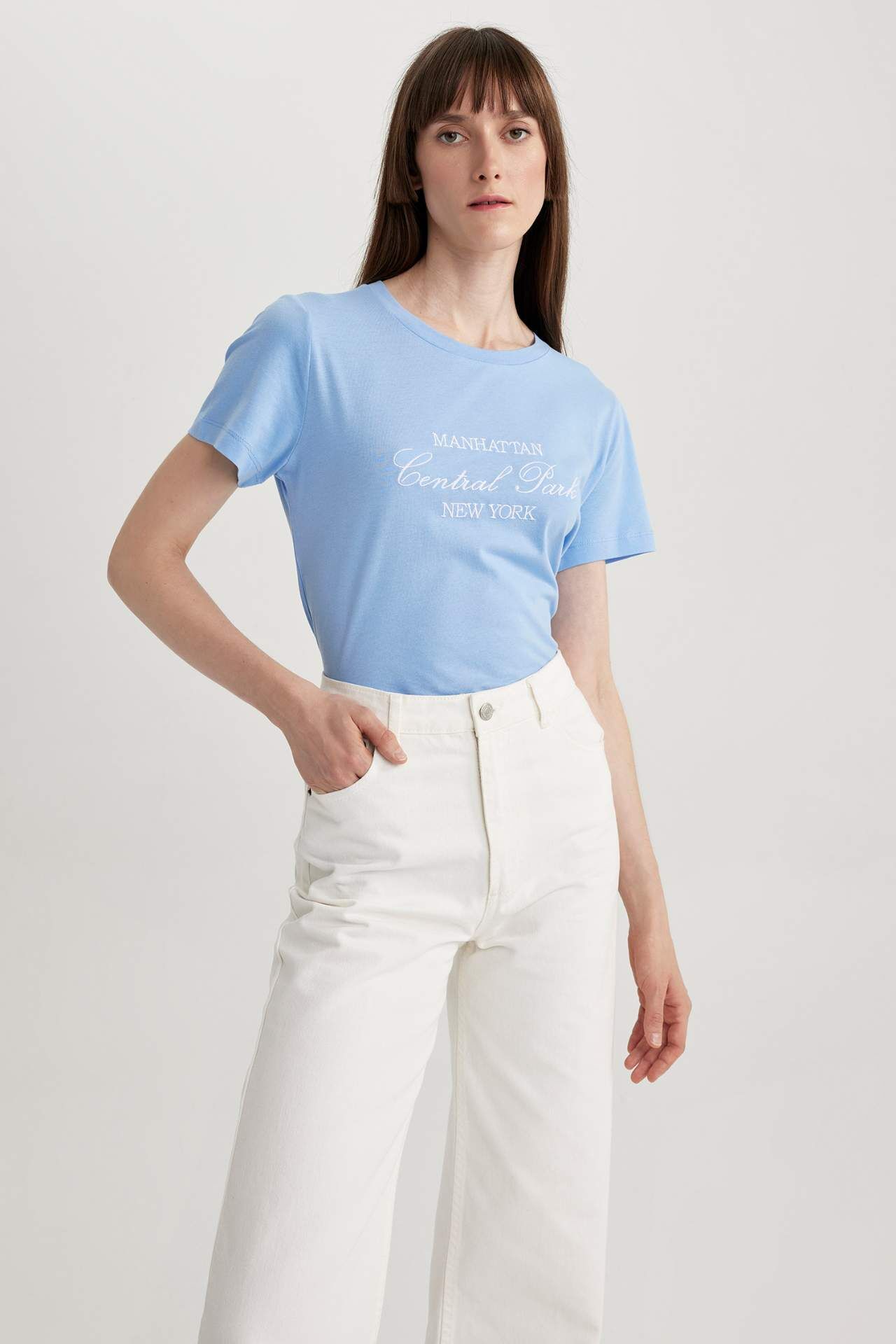 DeFacto Regular Fit Bisiklet Yaka Nakışlı Kısa Kollu Tişört Mavi