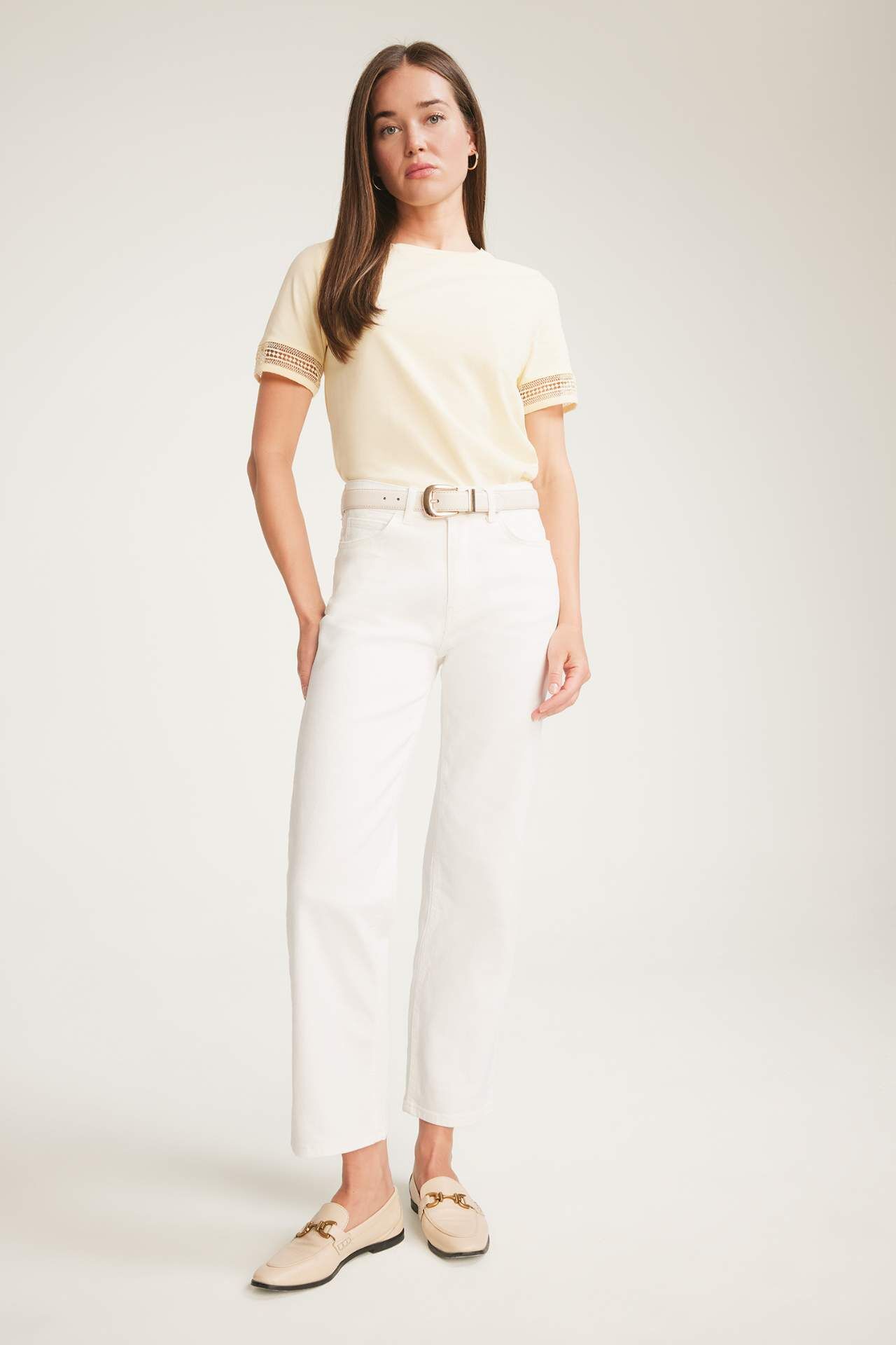 Yetişkin kadınlar için örme kısa kollu tişört. Dantel detayları ve sarı rengiyle dikkat çeken bu regular fit tişört, penye kumaştan üretilmiştir. İlkbahar/Yaz sezonu için idealdir ve bisiklet yaka tasarımıyla şıklığı tamamlar. Temel çeşit arasında yer almaktadır. Pamuk 100%,Pamuk 100%,Pamuk 100%,Pamuk 100%,Pamuk 100%,Pamuk 100% Manken Bedeni: Göğüs: 83 Boy: 1,78 Basen: 90 Bel: 62