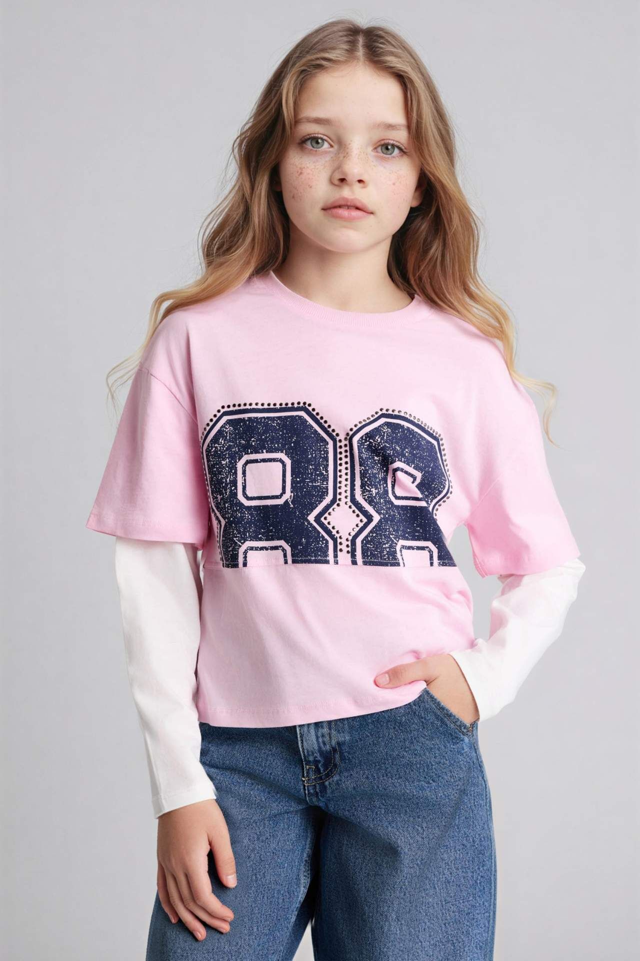 Regular Fıt Bisiklet Yaka Sayı Desenli Penye Uzun Kollu Tişört Kız Çocuk