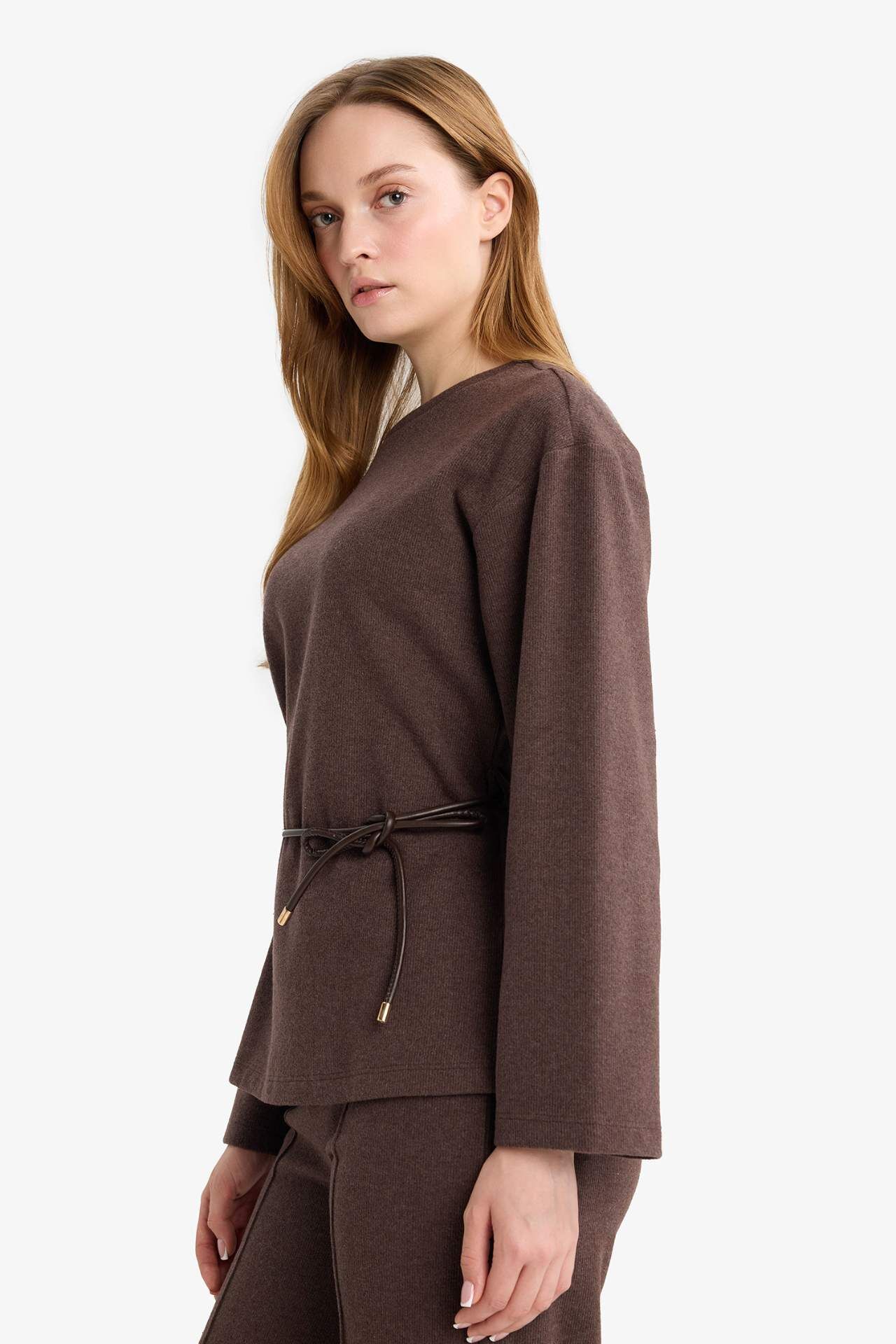 Regular Fit Bisiklet Yaka Selanik Bağlamalı Uzun Kollu Tişört