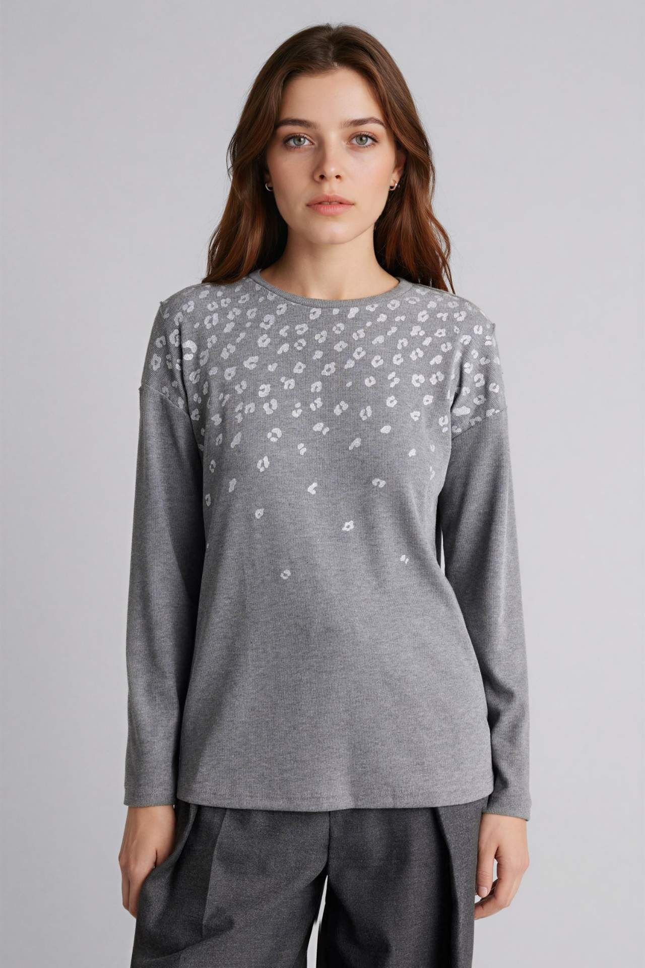 DeFacto Regular Fıt Bisiklet Yaka Taş Baskılı Uzun Kollu Tişört