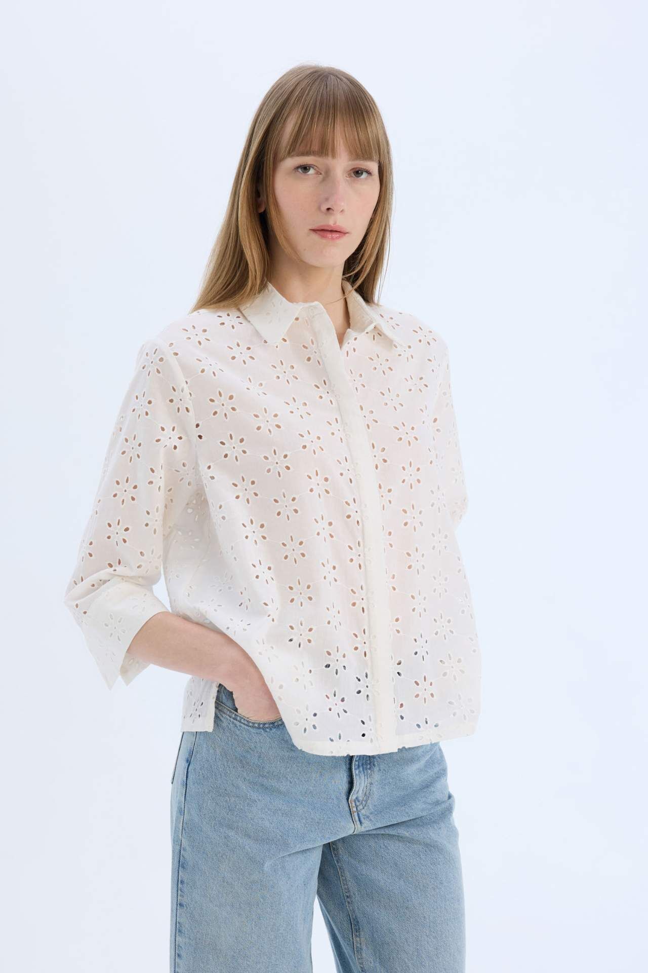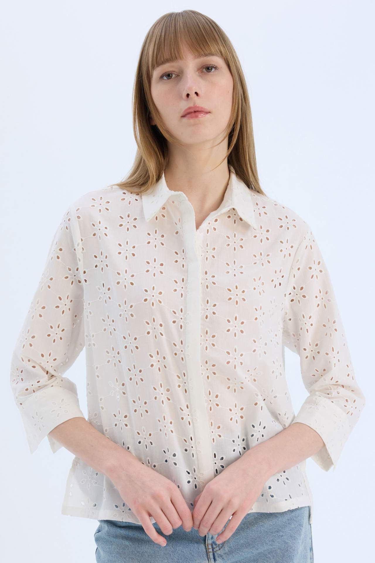 Regular Fit Brode Uzun Kollu Gömlek, zarif brode detayları ve rahat kesimiyle şıklığı günlük stile taşır. Hafif kumaşı sayesinde konforlu bir kullanım sunar, hem özel hem de günlük kombinlere kolayca uyum sağlar. Pamuk 100%,Pamuk 100%,Pamuk 100%,Pamuk 100%,Pamuk 100%,Pamuk 100% Manken Bedeni: Göğüs: 82 Boy: 1,8 Basen: 90 Bel: 61