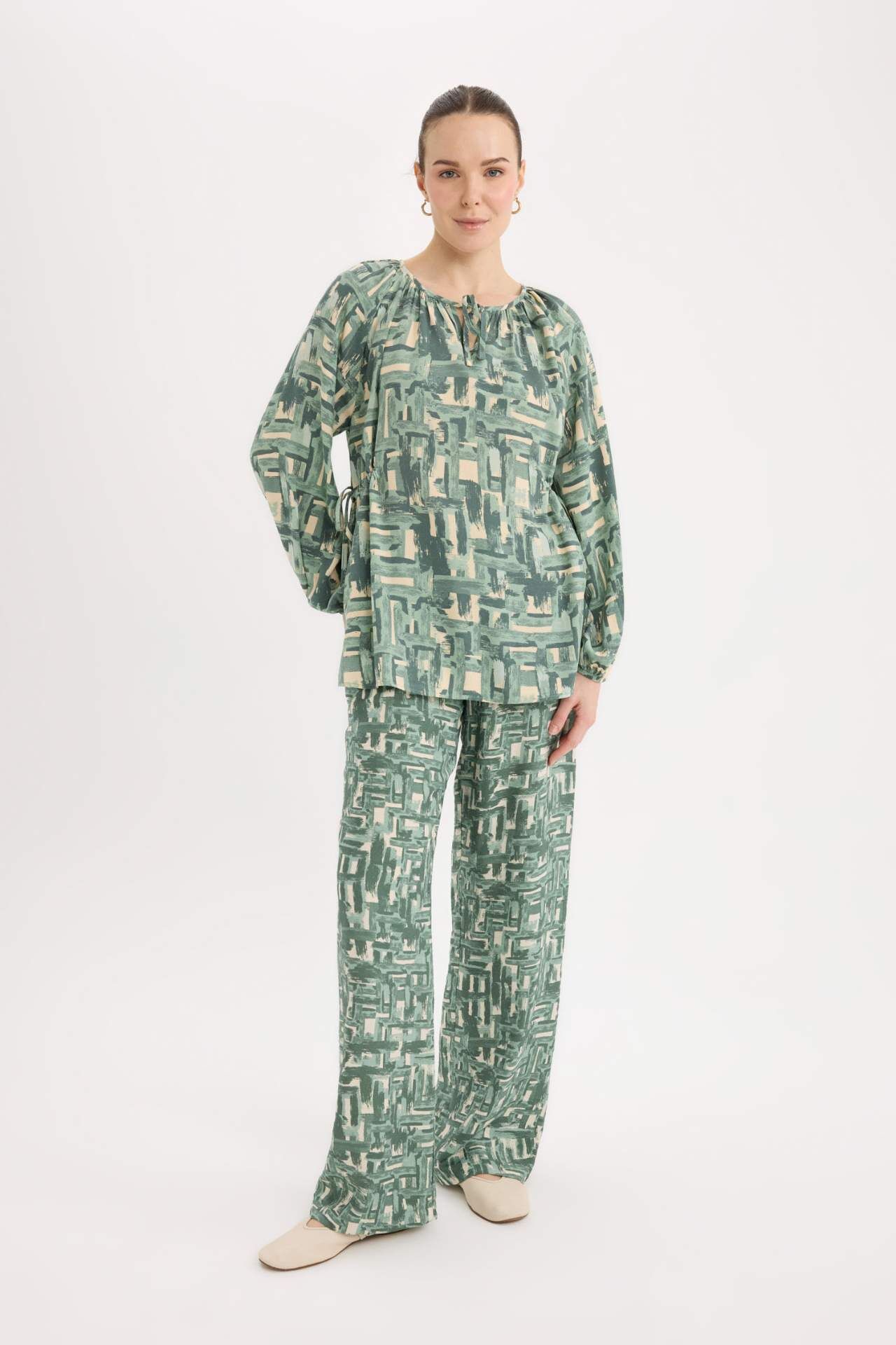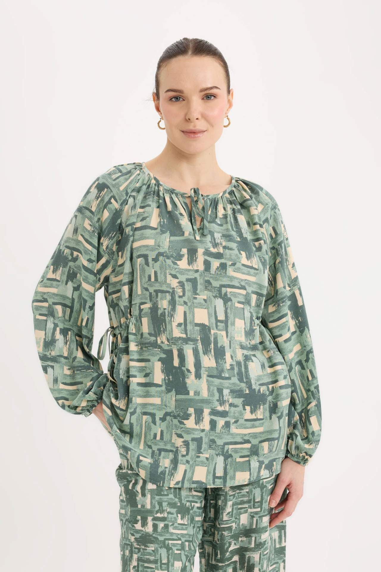 Regular Fit Büzgülü Yaka Desenli Uzun Kollu Bluz