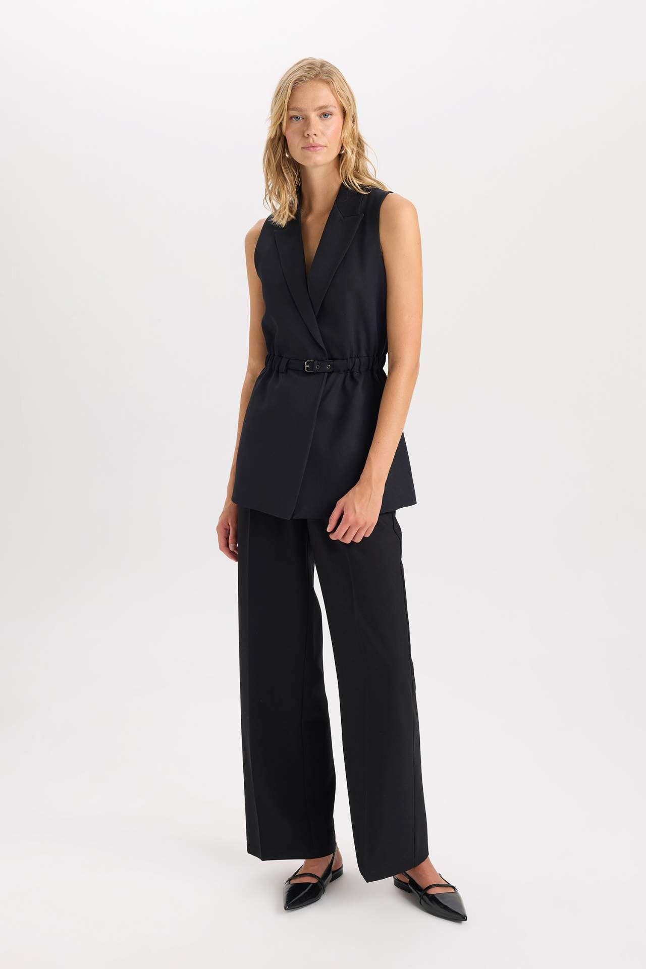 Regular Fit Ceket Yaka Basic Düz Kemerli Kolsuz Blazer Yelek