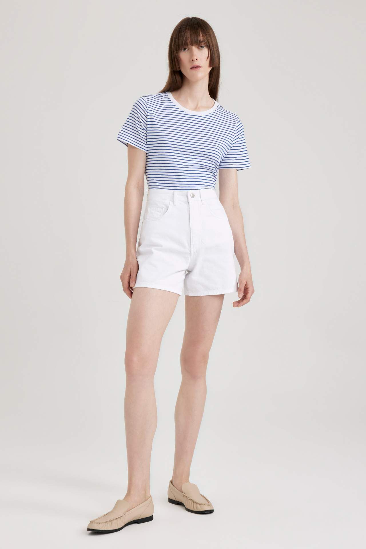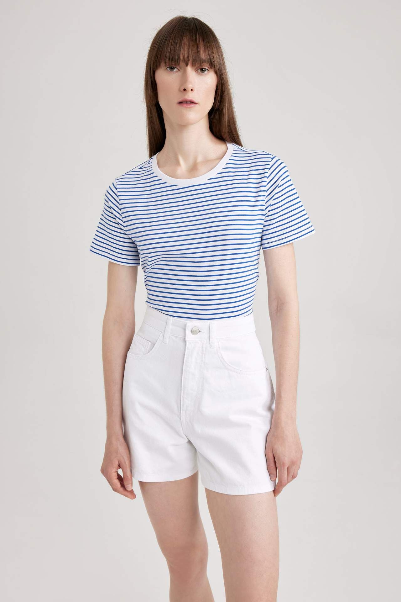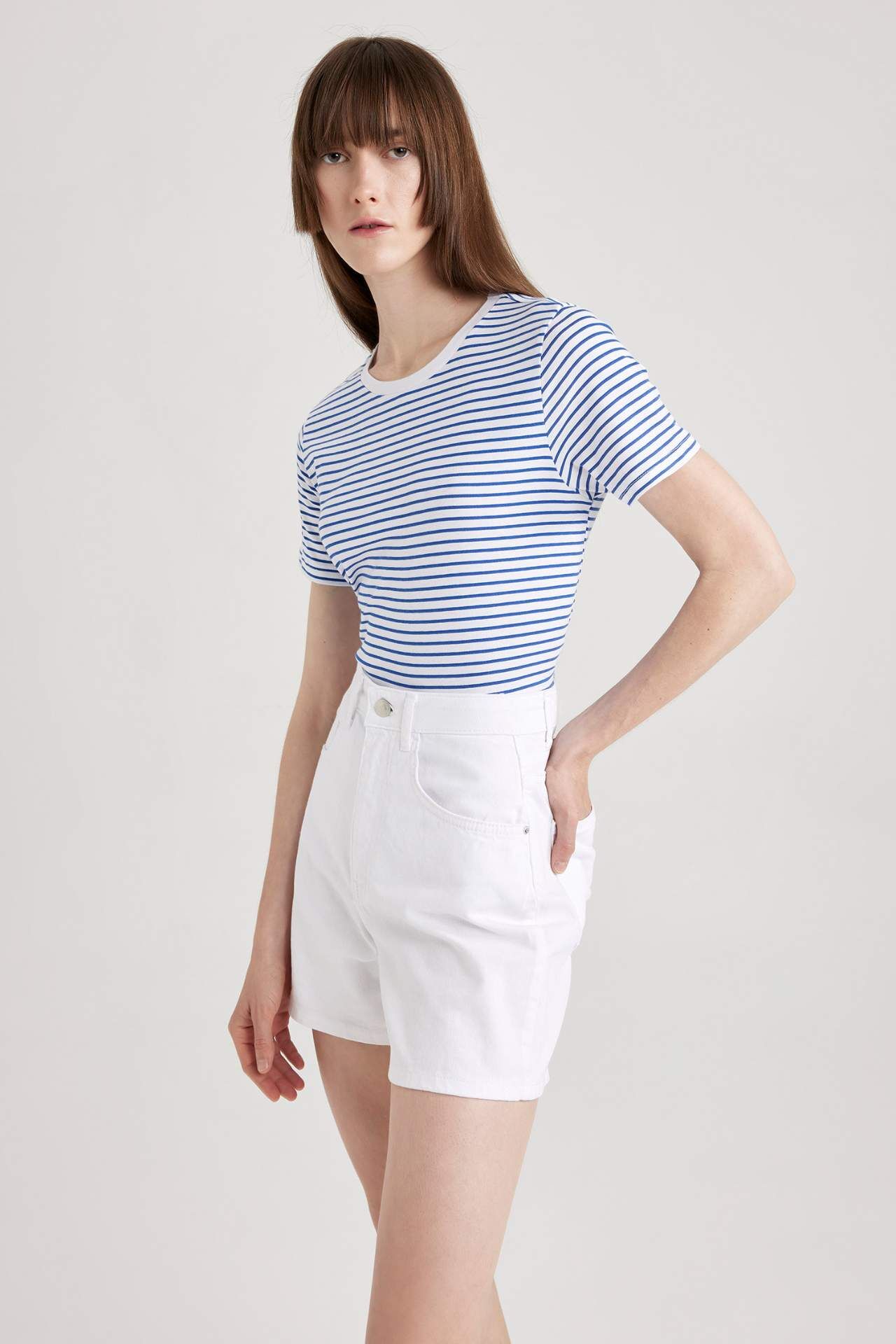 Çizgi desenli, pamuklu esnek kumaşı ile gün boyu rahat olacağınız kombinlerinizin vazgeçilmezi, pantolon ve eteklerinizle rahatlıkla kullanabileceğiniz, regular modeli ile tercihiniz olacak DeFacto Kadın Regular Fit Bisiklet Yaka Kısa Kollu Tişört. Pamuk 100%,Pamuk 100% Manken Bedeni: Göğüs: 82 Boy: 1,78 Basen: 88 Bel: 60