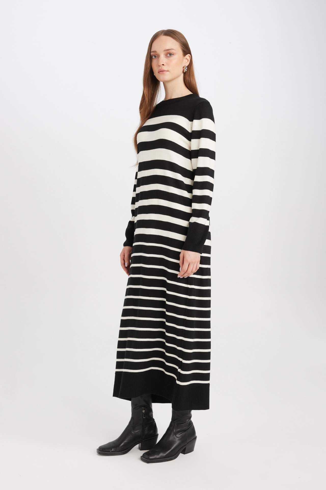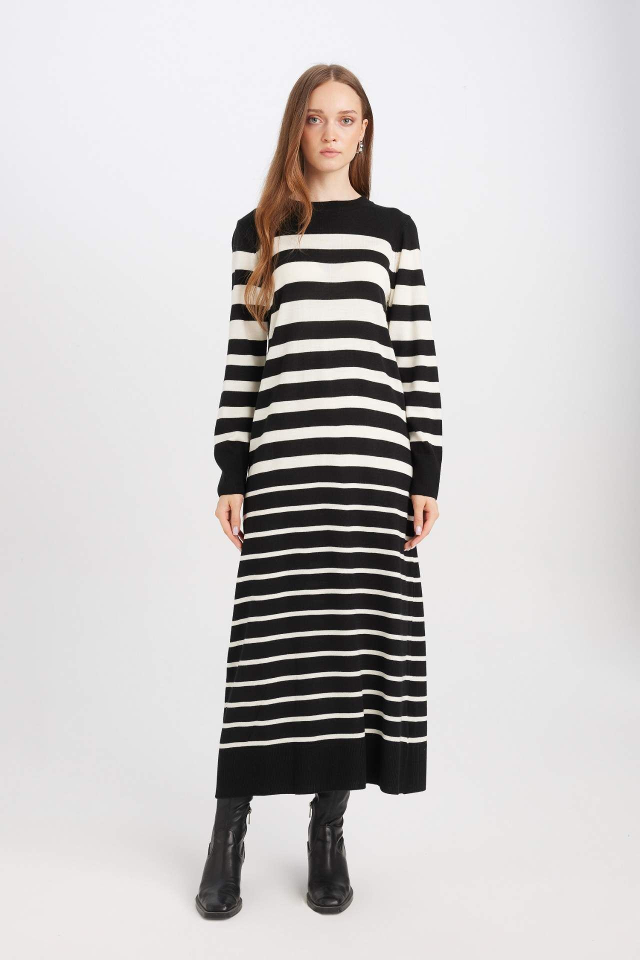 Regular Fit Çizgili Uzun Kollu Maxi Triko Elbise