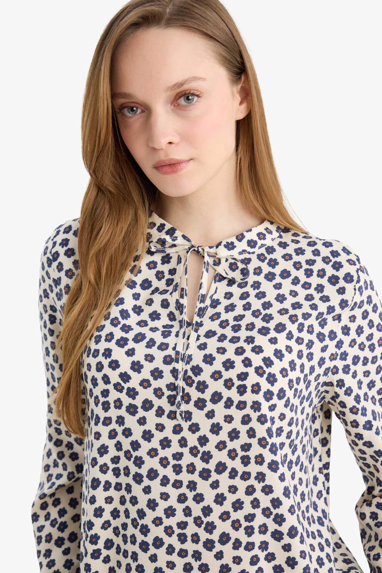 Regular Fit Desenli Uzun Kollu Bluz, zarif bağcıklı yaka detayı ve şık desenleriyle feminen bir görünüm sunar. Rahat kesimi ve yumuşak kumaşıyla gün boyu konfor sağlar, hem günlük hem özel anlara uygun şık bir tercihtir. Viskoz 100% Manken Bedeni: Göğüs: 84 Boy: 1,74 Basen: 92 Bel: 61