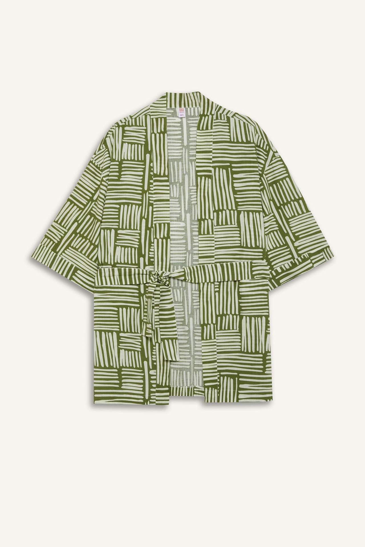 Pamuklu dokusuyla hafif ve rahat bir kullanım sunan Regular Fit kimono, kuşak detayıyla belinizi zarifçe vurgular. Desenli tasarımıyla plajda şık bir görünüm sağlar. Pamuk 100%,Pamuk 100%,Pamuk 100% Manken Bedeni: Göğüs: 82 Boy: 1,79 Basen: 90 Bel: 60