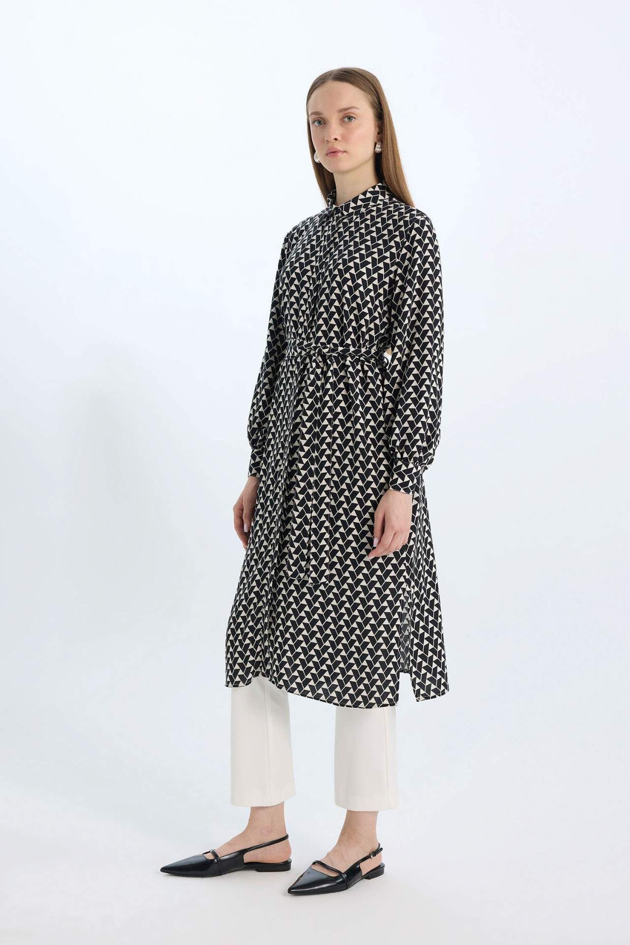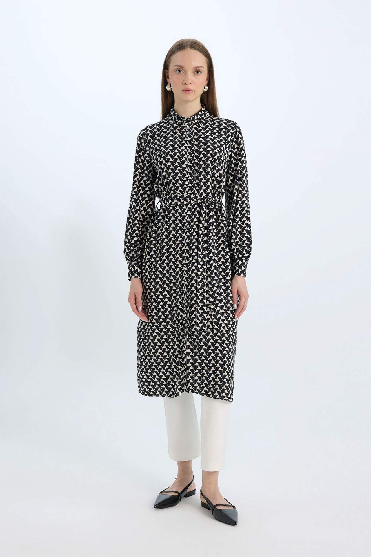 Regular Fit Desenli Kuşaklı Uzun Kollu Gömlek Tunik