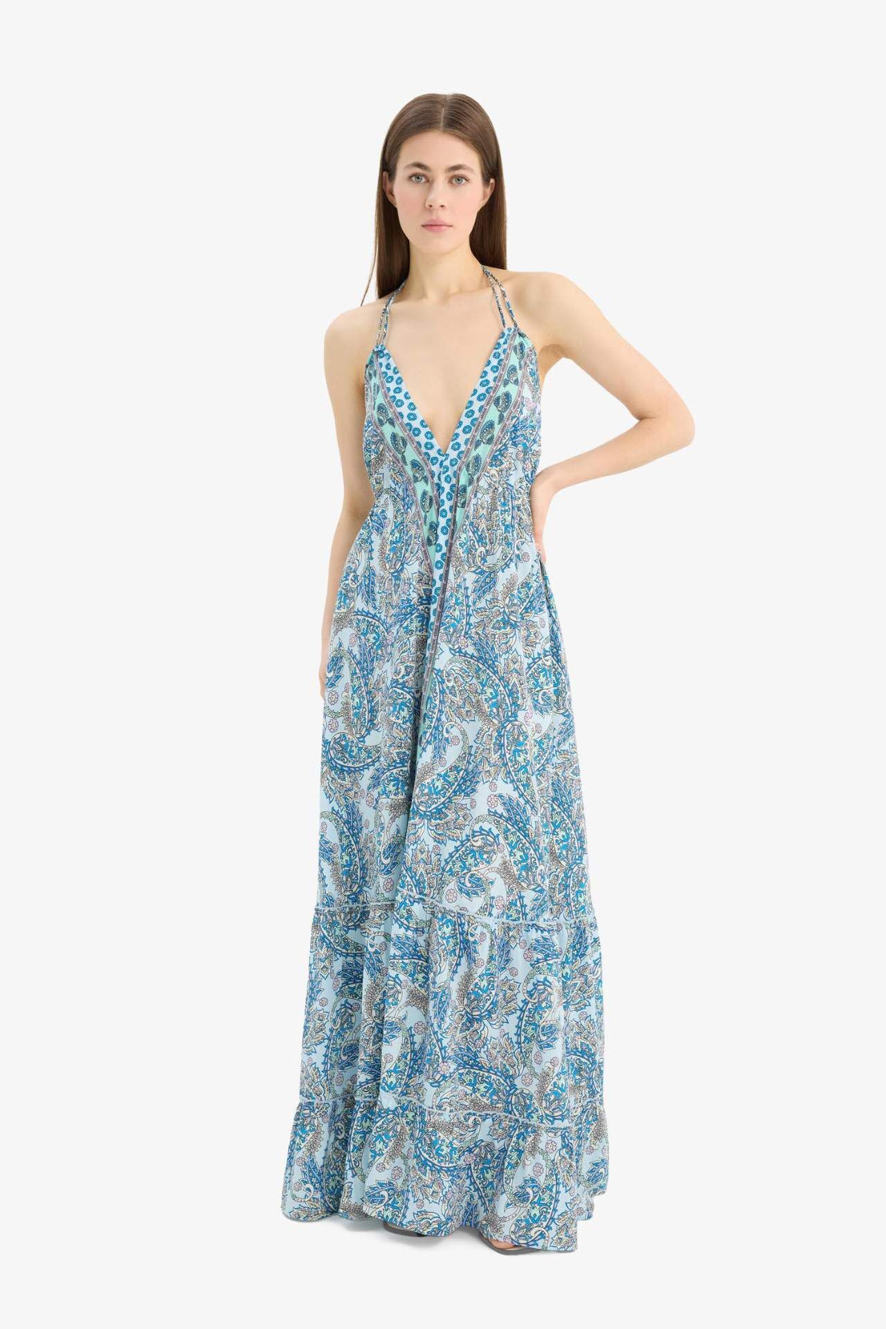 Regular Fit Etnik Desenli Boyundan Bağlamalı Maxi Plaj Elbisesi-Fall in Love E4581AX25SMBE114