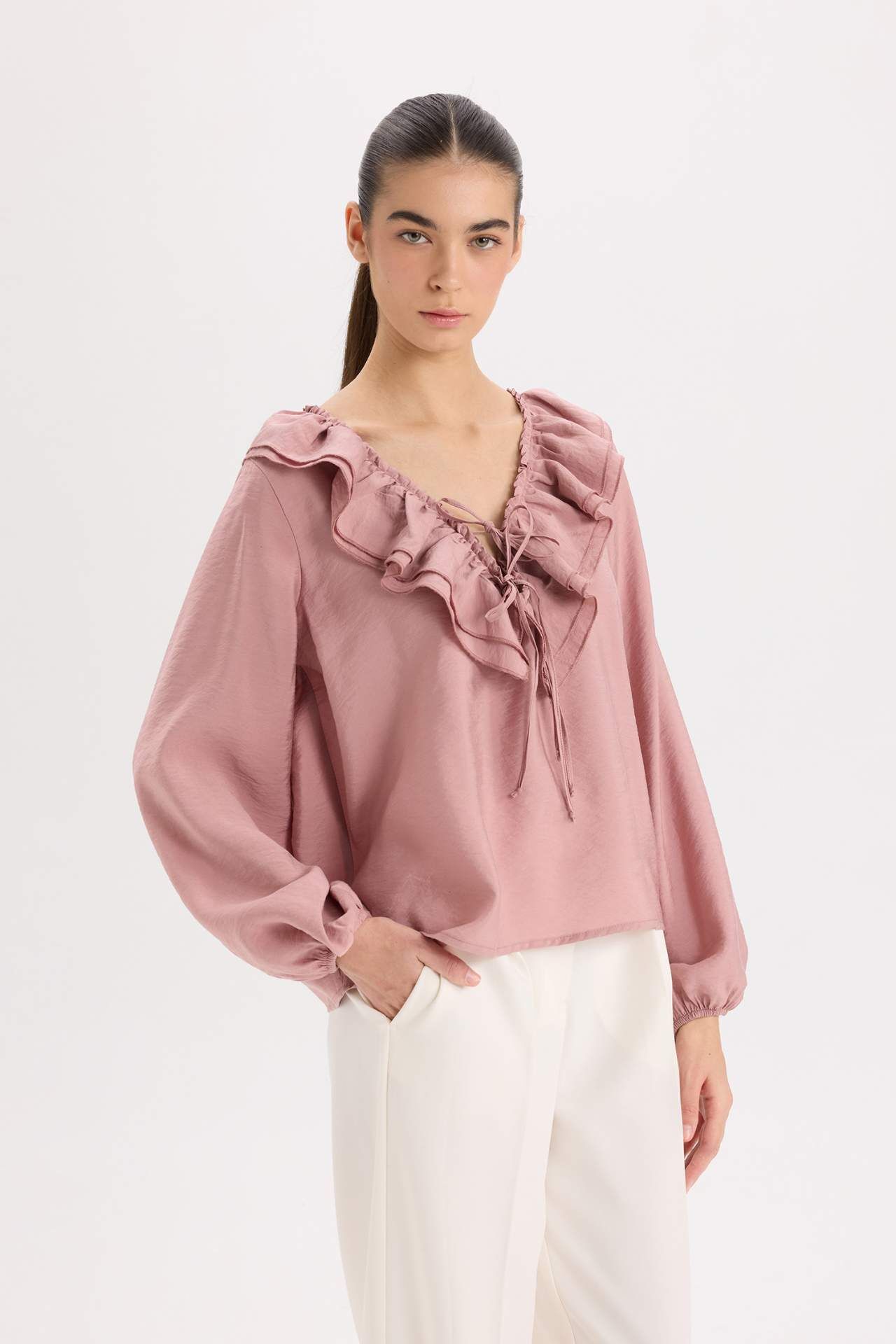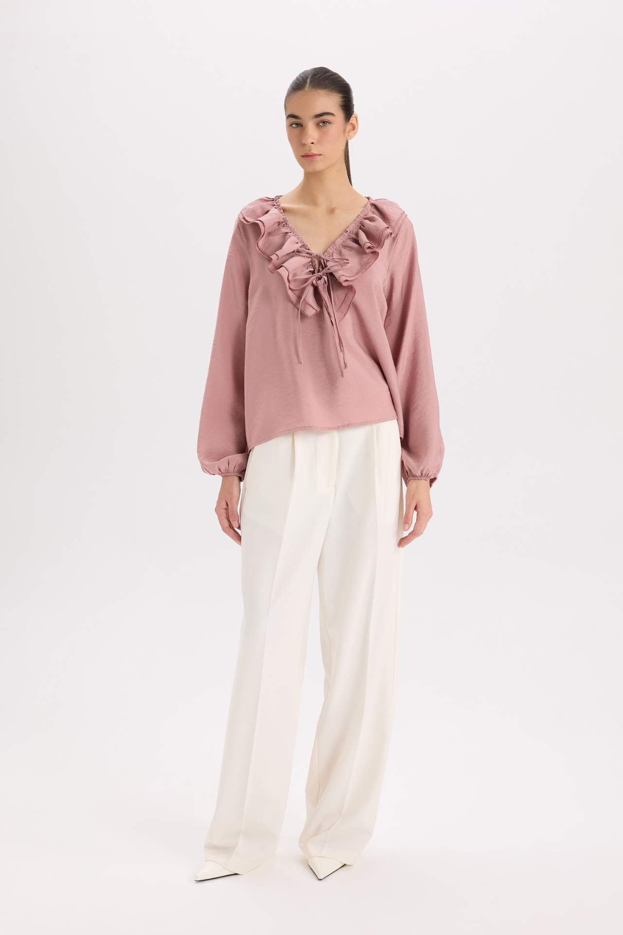 Regular Fit Fırfırlı V Yaka Basic Düz Uzun Kollu Bluz