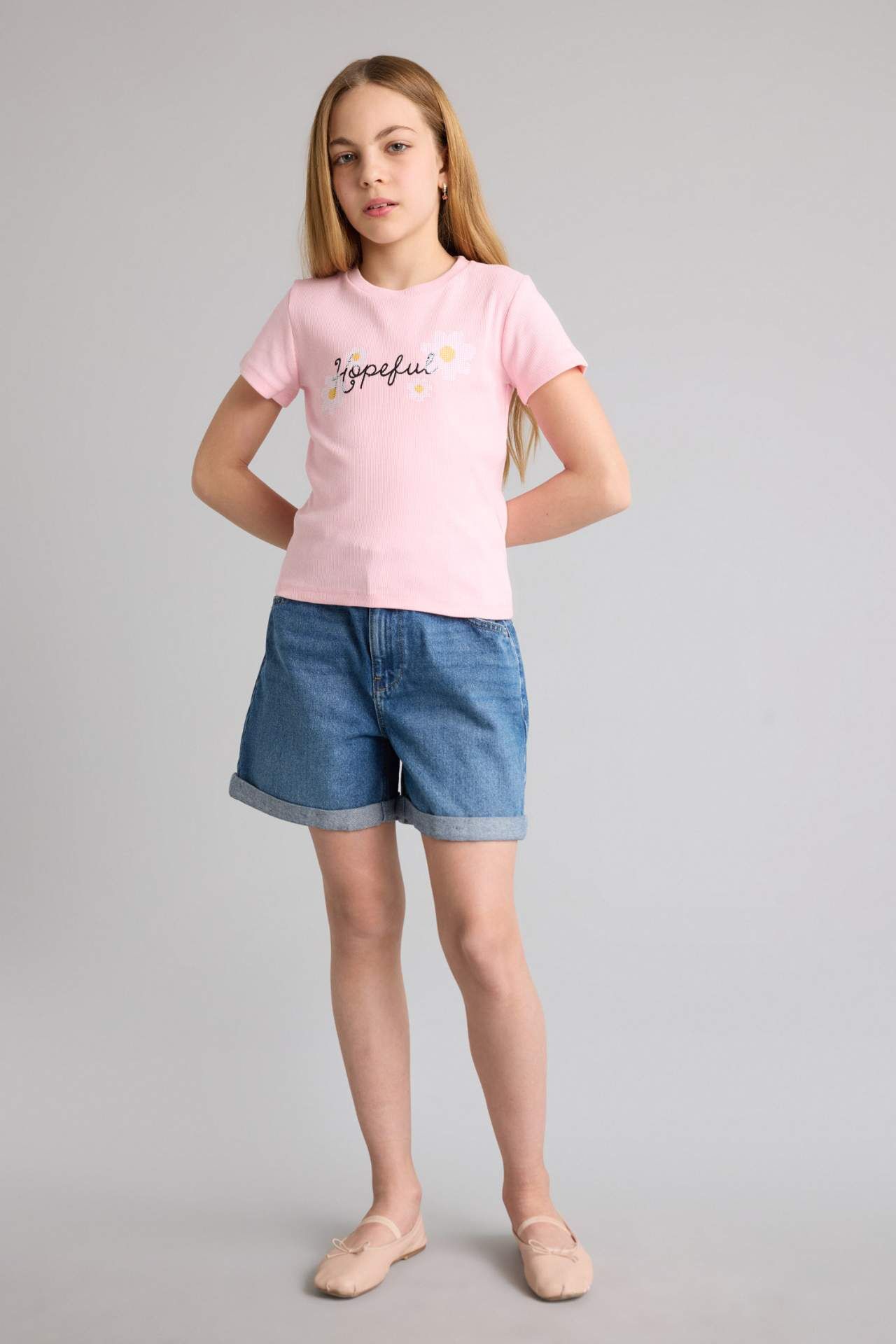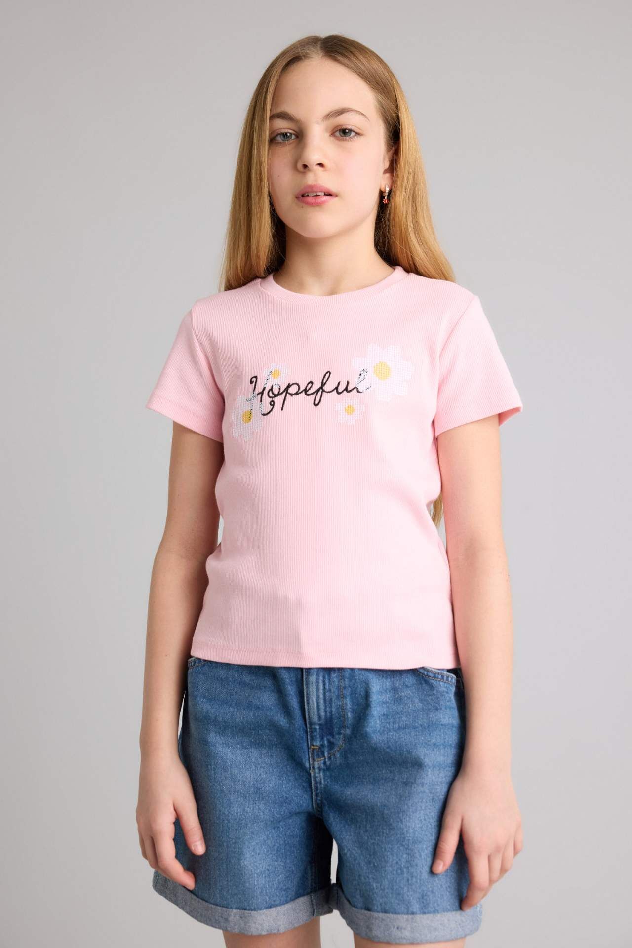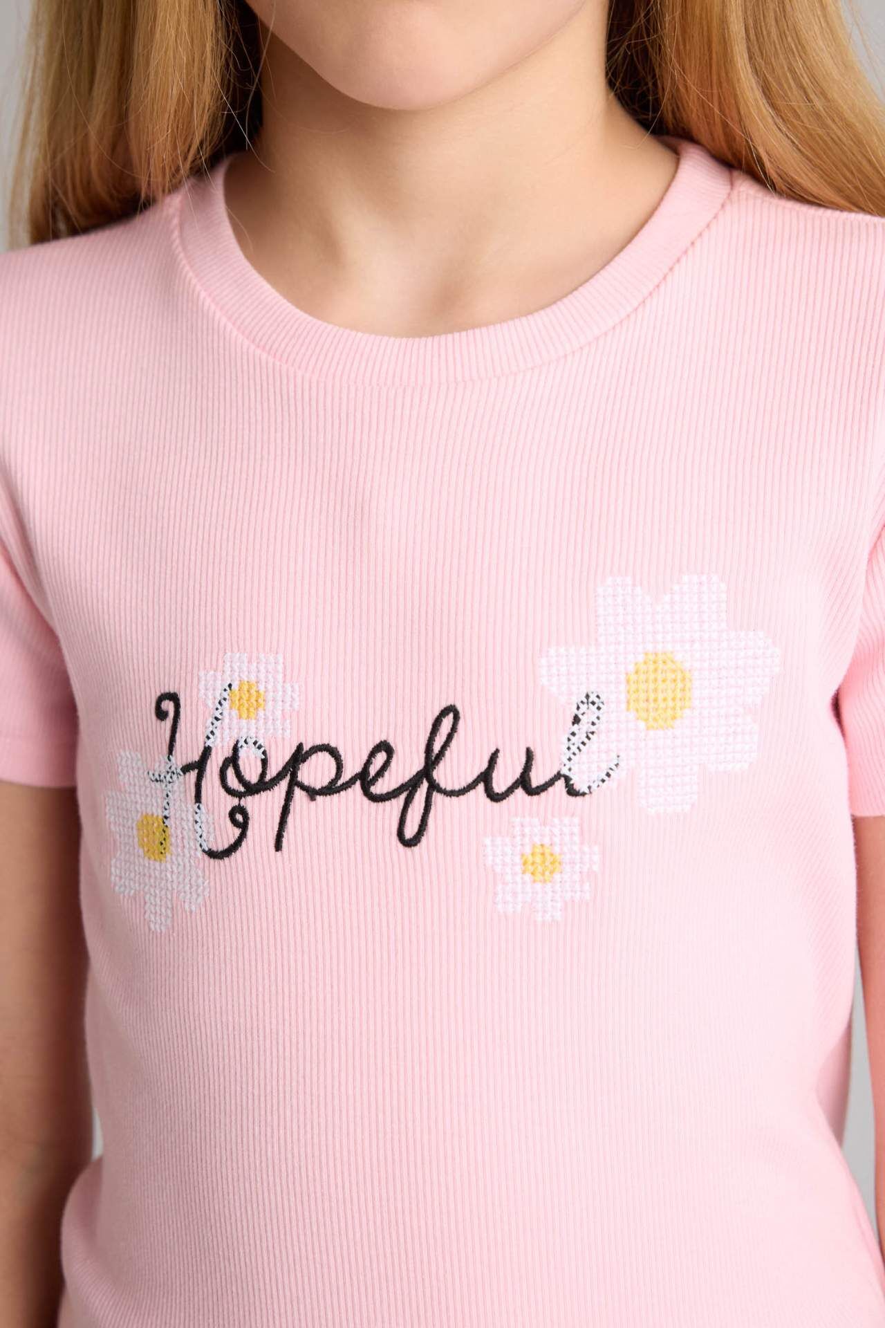DeFacto Regular Fıt Fitilli Kaşkorse Kısa Kollu Tişört Kız Çocuk