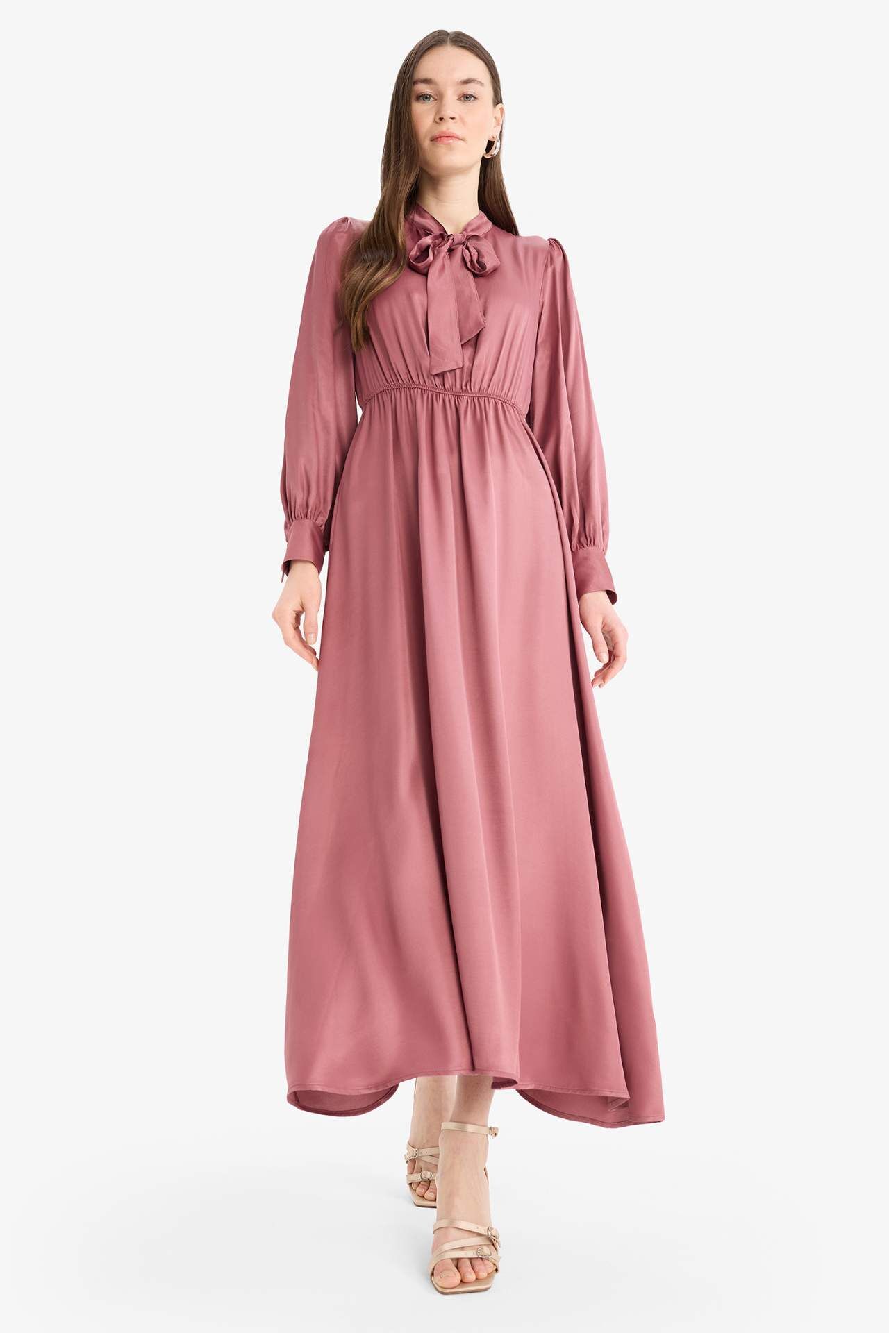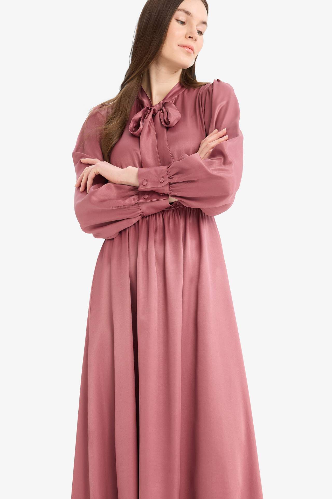 Regular Fit Fiyonk Yaka Saten Uzun Kollu Midi Elbise