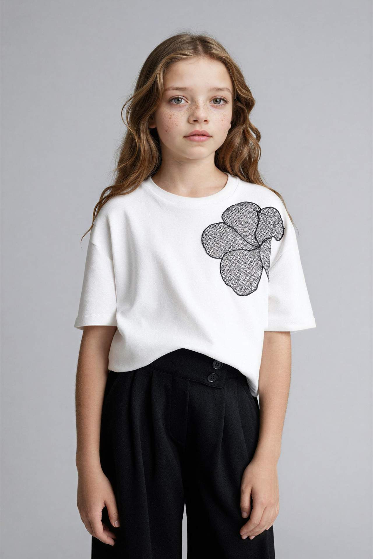 Beyaz tişört, sade tasarımını büyük siyah dantel çiçek aplikesiyle tamamlayarak zarif ve modern bir görünüm sunar. Yumuşak kumaşı konforlu kullanım sağlarken, rahat kesimi günlük şıklık için idealdir. Hem rahat hem şık kombinlerin vazgeçilmezi. Pamuk 100% Manken Bedeni: Göğüs: 62 Boy: 1,24 Basen: 73 Bel: 53