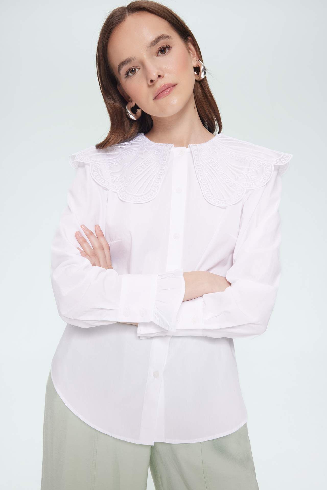 Yetişkin kadınlar için uzun kollu beyaz dokuma üst. Pamuk poplin kumaştan üretilmiş, regular fit kalıbıyla. İlkbahar/yaz mevsimlerinde tercih edilebilir. Temel çeşit kadın giyim koleksiyonunda yer alıyor. Boyu 62 cm. Pamuk 100%,Pamuk 100%,Pamuk 100%,Pamuk 100%,Pamuk 100%,Pamuk 100%,Pamuk 100% Manken Bedeni: Göğüs: 76 Boy: 1,73 Basen: 86 Bel: 58